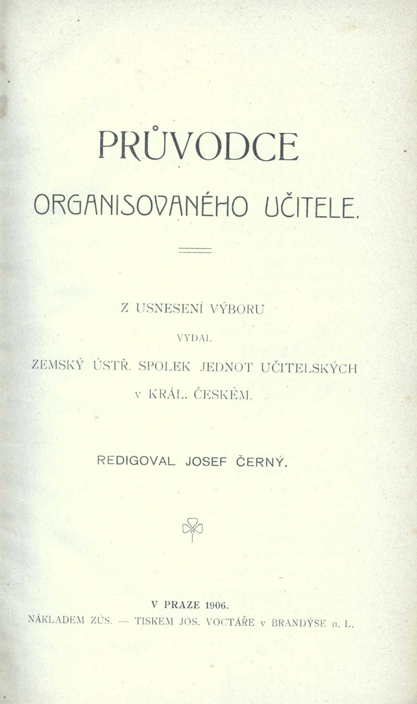 Title information Průvodce organisovaného učitele / redigoval Josef Černý Další autoři Černý, Josef, 1863-1942 (Editor) Corporation Zemský ústřední spolek jednot učitelských v království českém (Praha) (Publisher) Josef Voctář (tiskárna) (Printer) Publication V Praze : Zemský ústř. spolek jednot učitelských v Král. českém, 1906 Manufacture Tiskem Jos. Voctáře) Scope 424 s. ISBN (váz.) Country -cs Language Czech Note Zdob. plát. vazba. -- Předml. -- Obsah. -- Rejstřík.