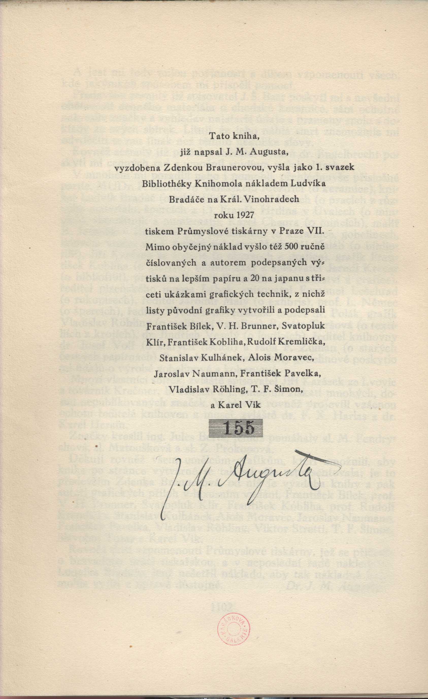 Annotation (dedkg) Document kind monografie Interrelated Works Rukověť sběratelova Praha : Nakladatelství Ludvíka Bradáče, 1926 Keywords česká literatura * užité umění * sběratelé * sběratelství * muzejní sbírky * ochrana sbírek * sbírka * sbírka umění * sbírky * soukromé sbírky * umělecké sbírky * bibliofilie * bibliofilské tisky * bibliofilský tisk * knihy * porcelán * numismatika * šperky * podpisy * signatury * značky * knižní značky * knižní grafika * grafici * grafické listy * grafické umění * grafický design * grafické techniky * rytecké techniky * umělecké techniky * sochy * sochaři * sochařství * textil * koberce * nábytek * historický nábytek * umělecký nábytek * hudební nástroje UDC 821.162.3 * 7.05 * 7.074 * 379.824 * 090.1 * 002 * -33.62 * 737 * 617.12 * 097 * 76-051 * 76 * 73.04 * 73-051 * 730 * -037 * 749.1 * 681.81 Bound in/Published with Rukověť sběratelova Uživatelské pole PNP Signatura KaG V C 54: Výtisk číslo 155 (číslováno tiskem): přednostní výtisk s grafickými přílohami. - Původní brož, obálka zachována, ale roztržena a oddělena od knižního bloku. - Brož zcela rozpadlá. - Silně poškozený stav. - Včetně přílohové brožury. Signatura KaG V C 54: Pod tiráží podspis J. M. Augusty. - Na první straně knihy rukopisná dedikace J. M. Augusty (podepsaná též L. Bradáčem) Jiřímu Karáskovi ze Lvovic: "Panu Jiřímu Karáskovi ze Lvovic uctivě odděný J. M. Augusta a L. Bradáč V Praze dne 21. března 1927). - V textu vpisky neznámého pisatele (např. s. 243, 244). U sign. KaG V C 54: Tiráž: "Tato kniha, již napsal J. M. Augusta, vyzdobena Zdenkou Braunerovou, vyšla jako 1. svazek Bibliothéky Knihomola nákladem Ludvíka Bradáče na Král. Vinohradech roku 1927 tiskem Průmyslové tiskárny v Praze VII. Mimo obyčejný náklad vyšlo též 500 ručně číslovaných a autorem podepsaných výtisků na lepším papíru a 20 na japanu s třiceti ukázkami grafických technik, z nichž listy původní grafiky vytvořili a podepsali František Bílek, V. H. Brunner, Svatopluk Klír, František Kobliha, Rudolf Kremlička, Stanislav Kulhánek, Alois Moravec, Jaroslav Naumann, Frantšiek Pavelka Vladislav Röhling, T. F. Šimon a Karel Vik." - Pod tiráží podpis J. M. Augusty. - Na první straně knihy rukopisná dedikace J. M. Augusty (podepsaná též L. Bradáčem) Jiřímu Karáskovi ze Lvovic: "Panu Jiřímu Karáskovi ze Lvovic uctivě odděný J. M. Augusta a L. Bradáč V Praze dne 21. března 1927). Links (1) - Monografie Signatura Přír.číslo Lokace Info KaG V C 54 xxx/KAG Sbírka