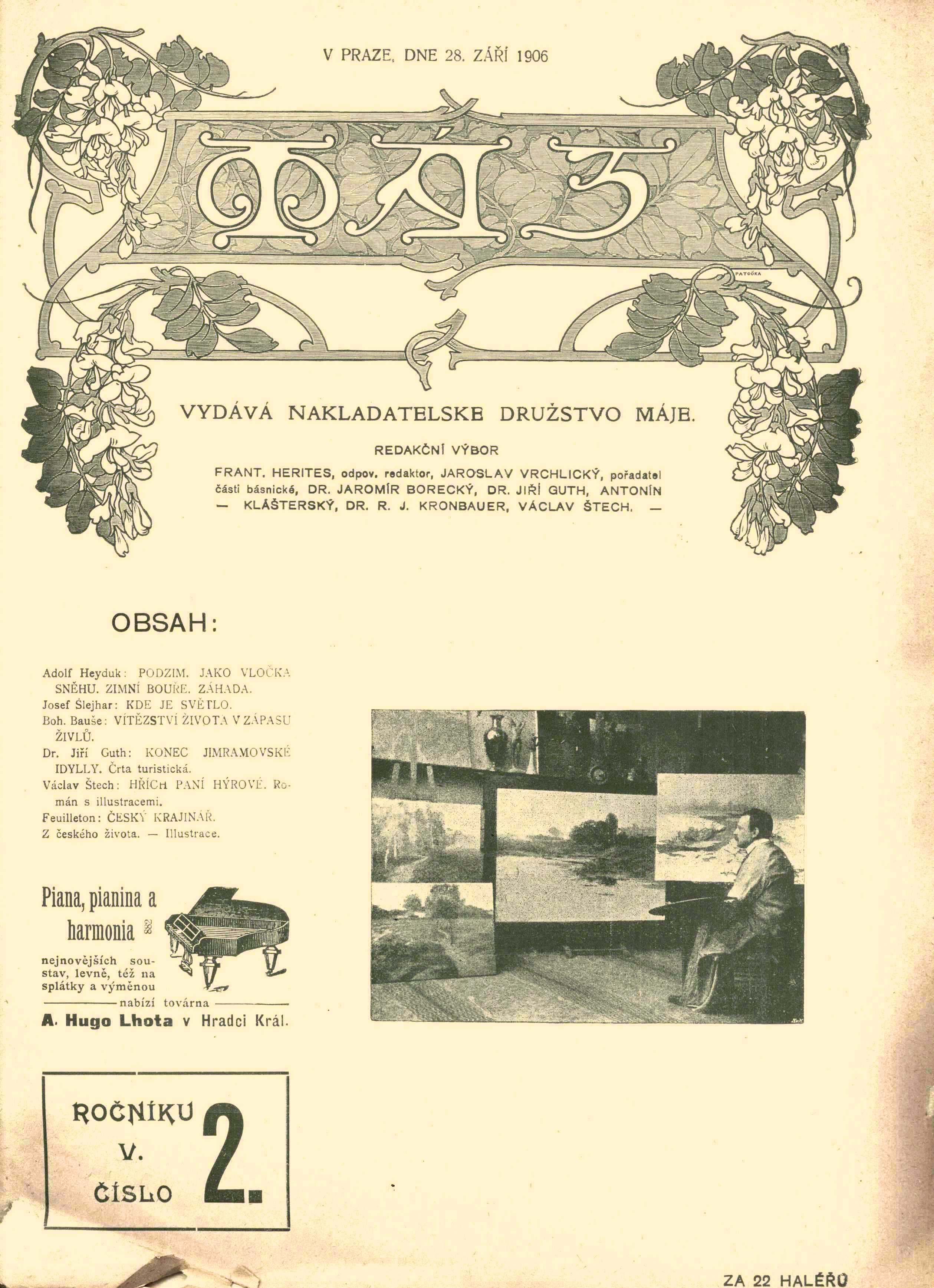 Title information Máj Další autoři Herites, František, 1851-1929 (Editor) Kronbauer, Rudolf Jaroslav, 1864-1915 (Editor) Vrchlický, Jaroslav, 1853-1912 (Editor) Borecký, Jaromír, 1869-1951 (Editor) Guth-Jarkovský, Jiří Stanislav, 1861-1943 (Editor) Klášterský, Antonín, 1866-1938 (Editor) Štech, Václav, 1859-1947 (Editor) Naske, František Xaver, 1884-1959 (Illustrator) Corporation Nakladatelské družstvo Máje (Publisher) Dr. Ed. Grégr a syn (nakladatelství, tiskárna) (Printer) Roč., číslo Ročník 5, číslo 1-52, 1906/1907 Publication V Praze : Nakladatelské družstvo Máje, 1906-1907 Manufacture Tiskem knihtiskárny dr. Ed. Grégra a syna Scope 798, 3 strany obsahu ročníku : ilustrace ; 31 cm Country Czech Republic Language Czech Note Zdobená obálka: stejné ornamentální záhlaví a různé reprodukované dílo na přední straně. - Množství stran reklamních příloh. - Ilustrace F. X. Naskeho (u románu na pokračování V. Štecha Hřích paní Hýrové). - Iniciálová výzdoba. - Černobílé ilustrace (kresby, fotografie, reprodukce uměleckých děl). - Faksimile autografů. - Nákresy, plány. - Dvojčíslo 13-14 bylo vánoční a mělo specificky řešenou obálku