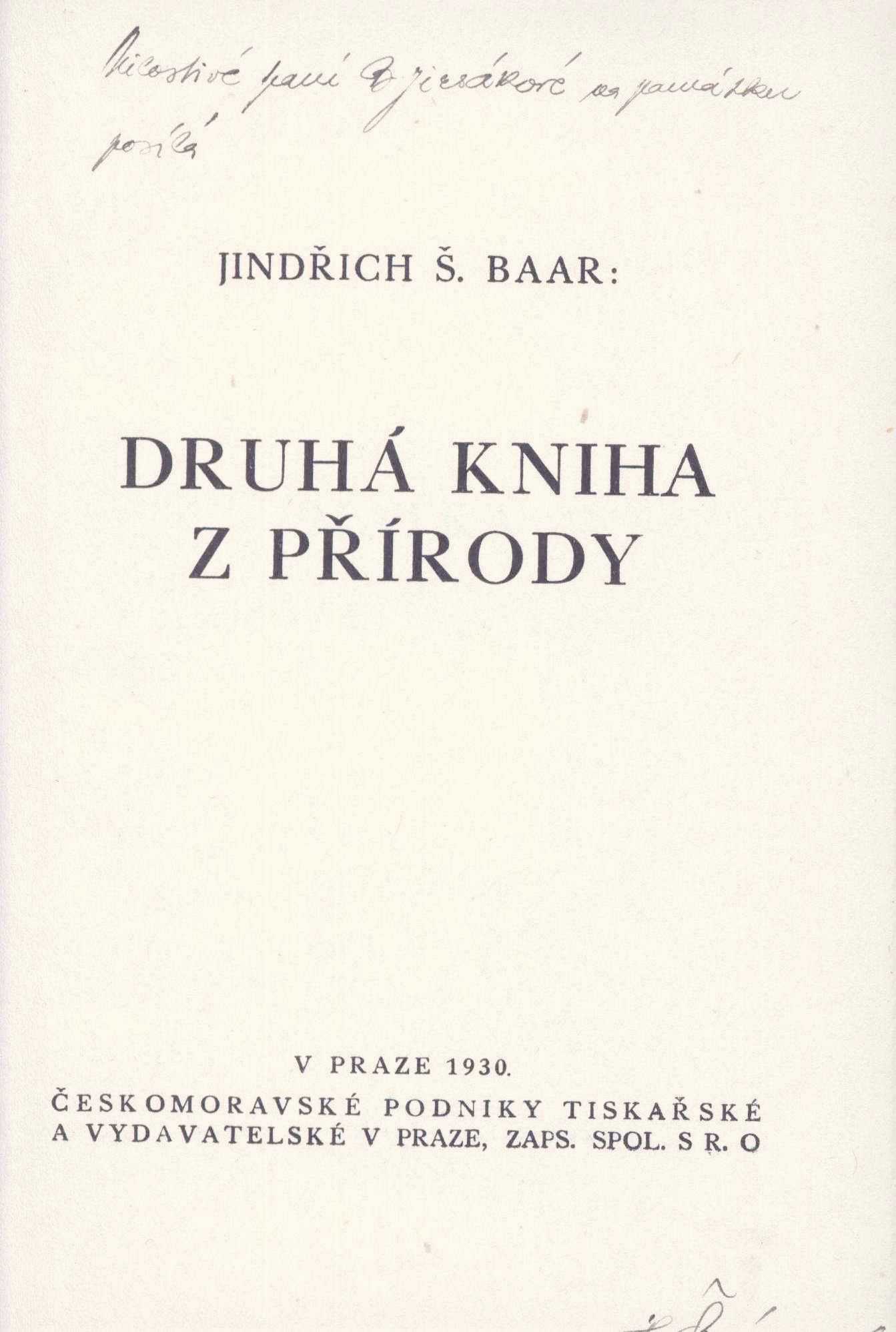Title information Druhá kniha z přírody / Jindřich Š. Baar Personal name Baar, Jindřich Šimon, 1869-1925 (Author) Další autoři Českomoravské podniky tiskařské a vydavatelské. 1908-1918 (Praha, Bratislava (Československo) (Publisher) Rolnická tiskárna (tiskárna) (Printer) Publication V Praze : Českomoravské podniky tiskařské a vydavatelské, 1930 Manufacture (Tiskem Rolnické tiskárny) Scope 286 s. ISBN (váz.) Edition Sebrané spisy beletristické J.Š. Baara sv. 22