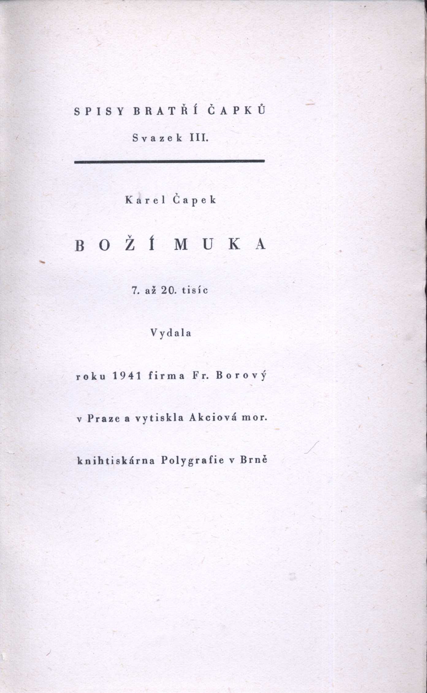 Title information Boží muka : kniha novel / Karel Čapek Personal name Čapek, Karel, 1890-1938 (Author) Další autoři Fr. Borový (firma) (Publisher) Akciová moravská knihtiskárna Polygrafie (Printer) Publication Praha : Fr. Borový, 1941 Manufacture Akciová mor. knihtiskárna Polygrafie) Scope 149 s. ; 20 cm Keywords česká literatura * česká próza * novely Copy cnt. 1, currently available 1 Document kind monografie Call number AFB 1468
