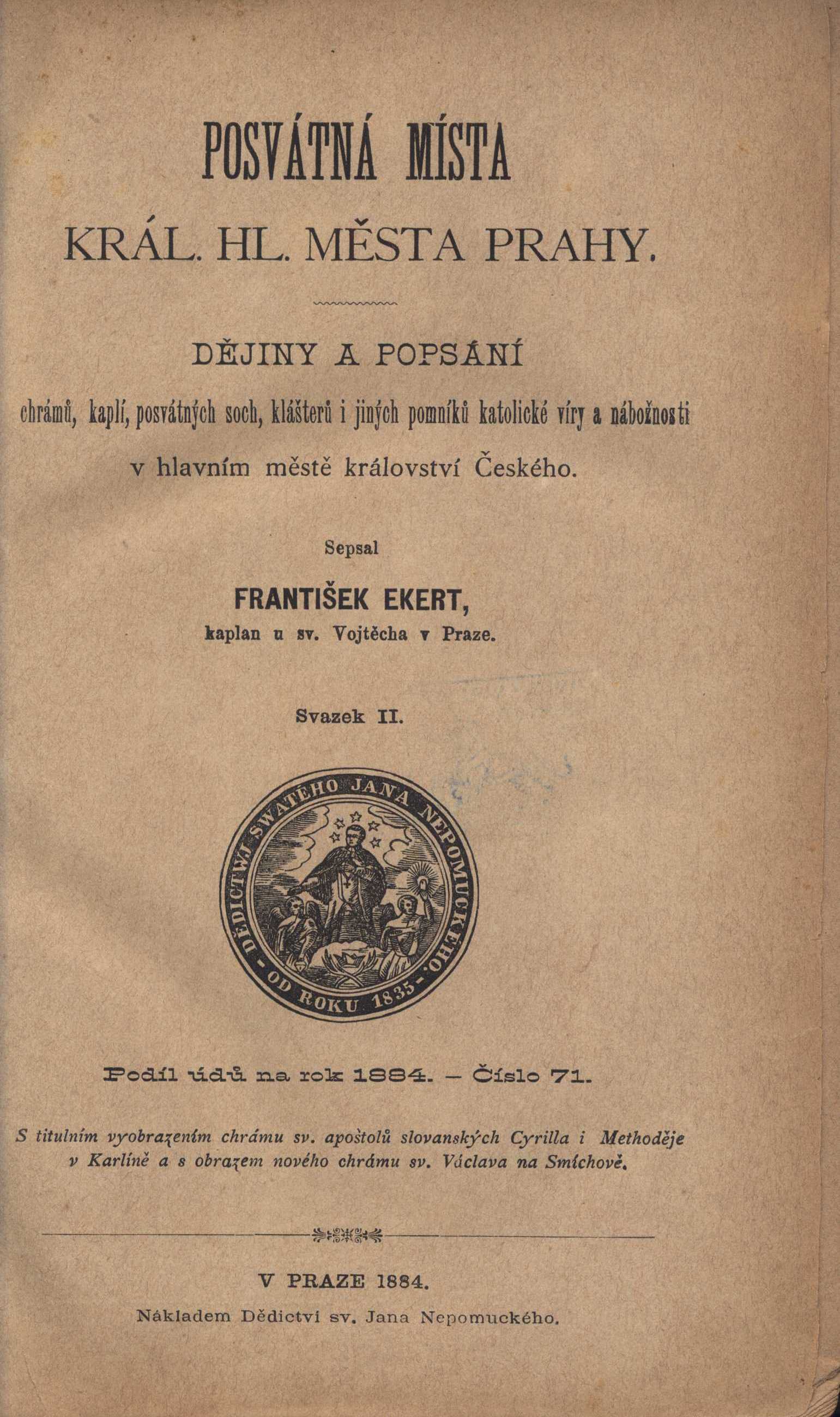$a Posvátná místa král. hl. města Prahy : $b dějiny a popsání chrámů, kaplí, posvátných soch, klášterů i jiných pomníků katolické víry a nábožnosti v hlavním městě království Českého. $n Svazek II / $c sepsal František Ekert