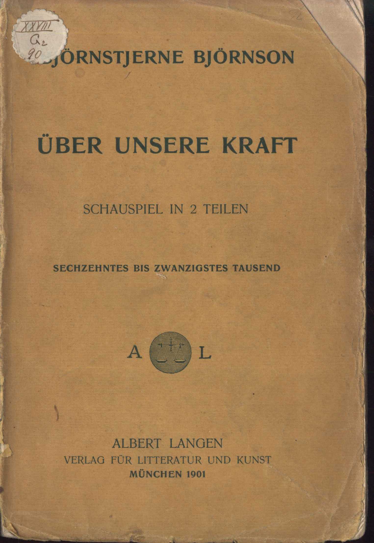 Title information Über unsere Kraft : Schauspiel in zwei Teilen / von Björnstjerne Björnson Personal name Bjørnson, Bjørnstjerne, 1832-1910 (Author) Další autoři Albert Langen Verlag (Mnichov, Německo) (Publisher) Hesse & Becker (Leipzig, Německo) (Printer) Edition statement sechzehntes bis zwanzigstes Tausend Publication München : Albert Langen, 1901 Manufacture Hesse & Becker) Scope 315 s., [1] l. obr. příl. : il. ISBN brož. Country Germany Language German Language of the original Norwegian Note Na přední straně obálky a na titulním listu nakladatelský signet. - Jeden list obrazové přílohy na křídovém papíře: černobílý fotografický portrét autora doplněný faksimilí jeho podpisu. - Sazba gotikou. - Nakladatelská reklama.