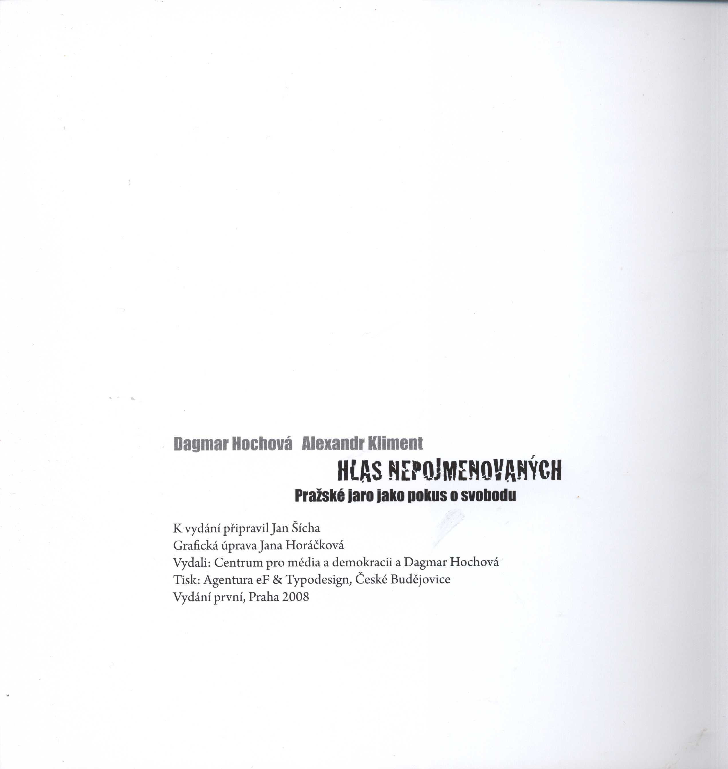 Title information Hlas nepojmenovaných : Pražské jaro jako pokus o svobodu / Dagmar Hochová, Alexandr Kliment ; [k vydání připravil Jan Šícha ; grafická úprava Jana Horáčková] Personal name Hochová, Dagmar, 1926-2012 (Photographer) Další autoři Kliment, Alexandr, 1929-2017 (Author) Šícha, Jan, 1967- (Editor) Horáčková, Jana, 1962- (Book designer) Edition statement Vyd. 1. Publication Praha : Centrum pro média a demokracii : Dagmar Hochová, 2008 Manufacture Agentura eF & Typodesign) Scope 69 s. : il. ISBN 978-80-254-2774-3 (brož.) Country Czech Republic Language Czech Note Obálka. - Frontispis. - Černobílé fotografie. - Poznámka o autorech. - Ediční poznámka