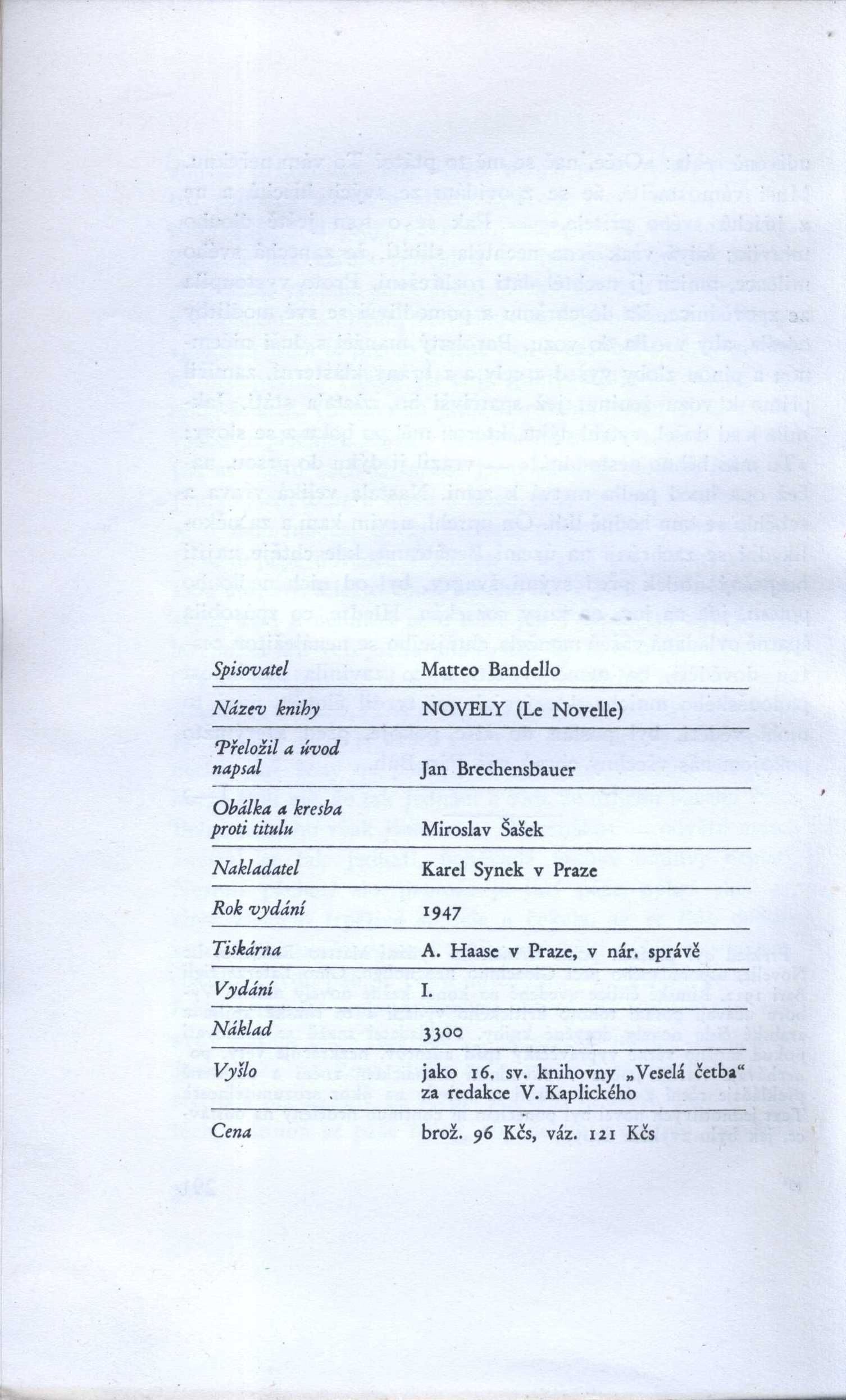 Title information Novely / Matteo Bandello ; [přeložil a úvod napsal Jan Brechensbauer ; obálka a kresba proti titulu Miroslav Šašek] Personal name Bandello, Matteo, 1485-1561 (Author) Další autoři Brechensbauer, Jan, 1888-1961 (Translator) (Author of introduction) Šašek, Miroslav, 1916-1980 (Bookjacket designer) (Illustrator) Corporation Karel Synek (nakladatelství) (Publisher) Andreas Haase (nakladatelství a tiskárna) (Printer) Edition statement Vyd. 1. Publication V Praze : K. Synek, 1947 Manufacture A. Haase) Scope 291 s. : il. ISBN brož. Edition Veselá četba sv. 16