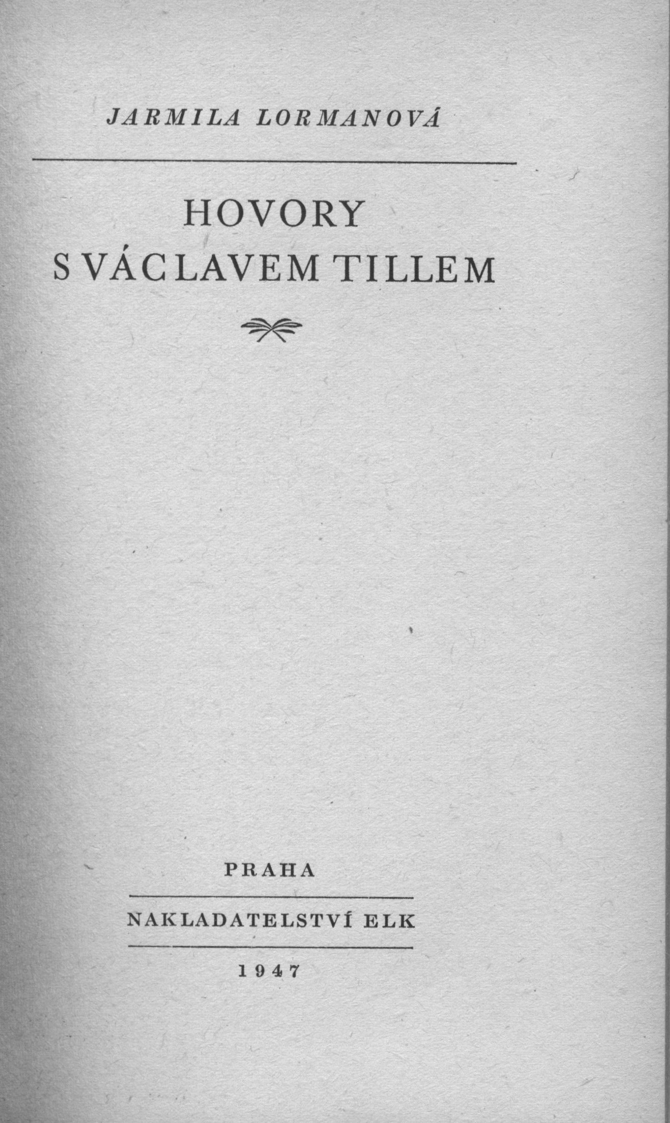 Title information Hovory s Václavem Tillem / Jarmila Lormanová ; [podle typografické úpravy Oldřicha Menharta vytiskla ...] Personal name Lormanová, Jarmila, 1910-2000 (Author) Další autoři Tille, Václav, 1867-1937 (Author in quotations or text abstracts) Menhart, Oldřich, 1897-1962 (Typographer) Corporation Evropský literární klub (nakladatelství) (Publisher) Mladá fronta (nakladatelství) (Printer) (Printer of plates) Edition statement V prvním vydání Publication Praha : nakladatelství ELK, 1947 Manufacture (tiskárna Mladá fronta) Scope 58 s., [3] l. obr. příl. ; 20 cm ISBN brož. Country Czech Republic Language Czech Note Zdobená obálka. - Patitul s nakladatelskou značkou. - Titulní list. - Vložené nestránkované 3 fotografické přílohy na hlazeném papíře. - Obsah. - Tiráž.