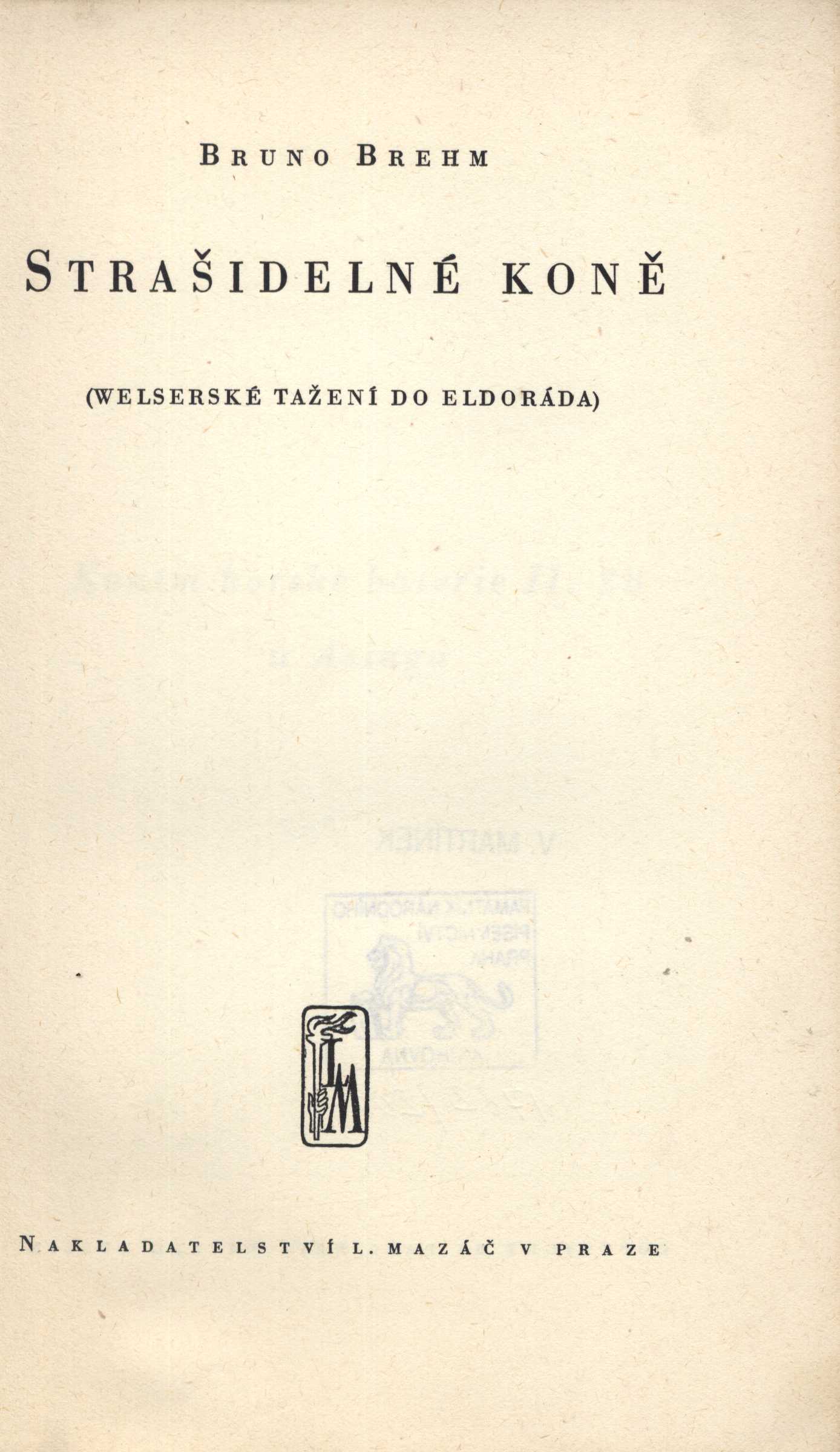 Title information Strašidelné koně : welserské tažení do Eldoráda / Bruno Brehm ; [přeložil Josef Špičák ; podle úpravy A.B. Kohouta ; obálku provedl Václav Hejna ; vazu provedl Jaroslav Šváb] Personal name Brehm, Bruno, 1892-1974 (Author) Další autoři Špičák, Josef, 1918-1989 (Translator) Kohout, Alois Bohumil, 1897-1977 (Book designer) Hejna, Václav, 1914-1985 (Bookjacket designer) Šváb, Jaroslav, 1906-1999 (Bookjacket designer) Corporation L. Mazáč (nakladatelství) (Publisher) Česká grafická Unie (tiskárna a nakladatelství) (Printer) Publication V Praze : L. Mazáč, 1941 Manufacture (Česká grafická Unie) Scope 220 s. ; 8° ISBN brož. Edition Knihovna Epocha sv. 18