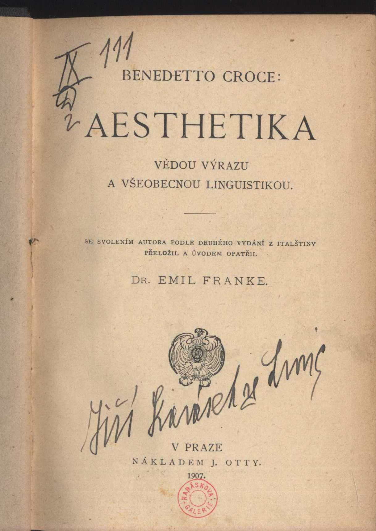 Title information Aesthetika vědou výrazu a všeobecnou linguistikou / Benedetto Croce ; se svolením autora podle druhého vydání z italštiny přeložil a úvodem opatřil Emil Franke Personal name Croce, Benedetto, 1866-1952 (Author) Další autoři Franke, Emil, 1880-1939 (Author of introduction) (Translator) Karásek ze Lvovic, Jiří, 1871-1951 (Inscriber) Corporation Nakladatelství Jan Otto (Publisher) Unie (tiskárna) (Printer) Publication V Praze : Nákladem J. Otty, 1907 Manufacture (Tiskem "Unie") Scope xxxiii, 96 s. ISBN (váz.) Country Czech Republic Language Czech Language of the original Italian Note Na titulním listu nakladatelský signet. - Úvod E. Frankeho.