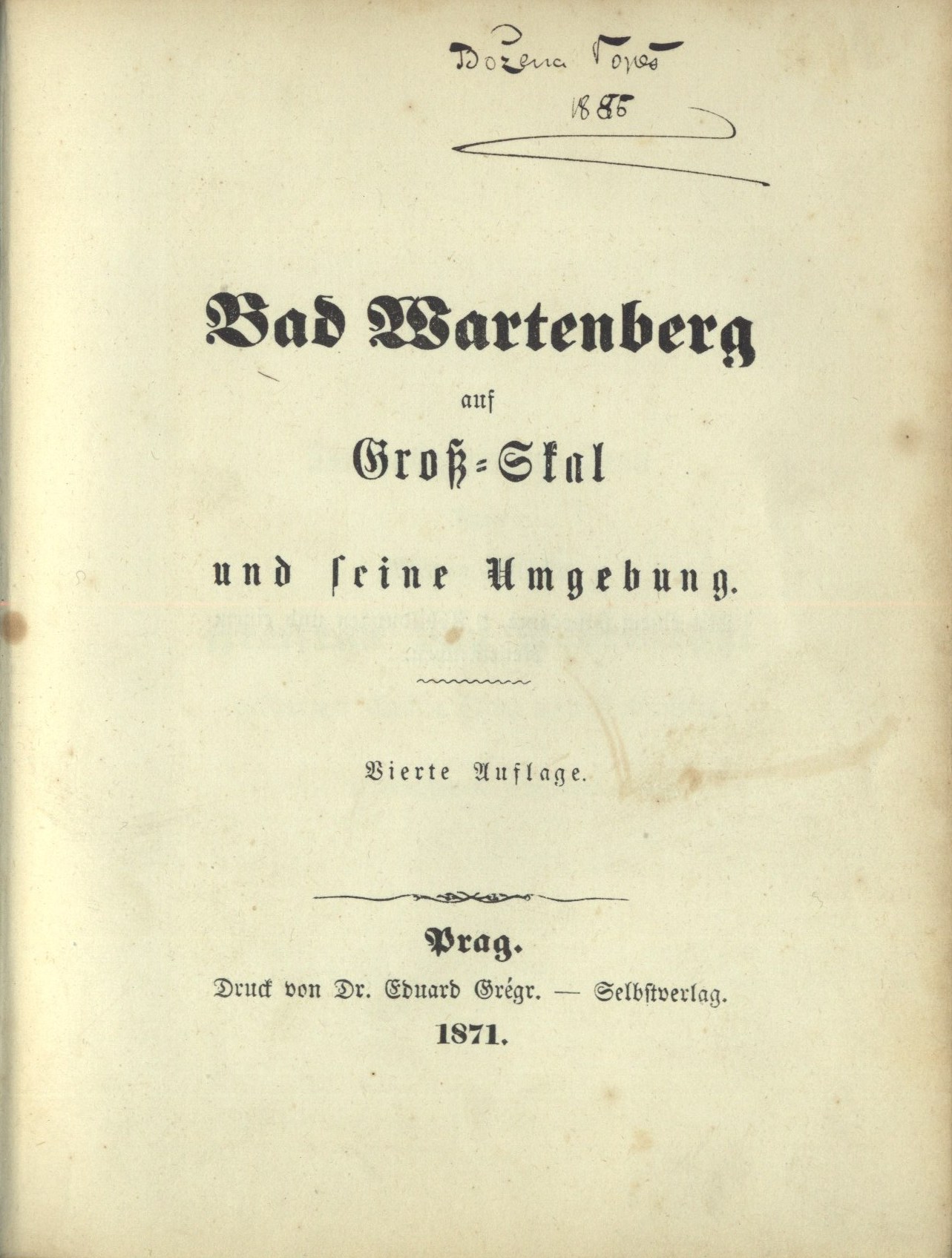 Title information Bad Wartenberg auf Groß-Skal und seine Umgebung : [mit einem Panorama, 9 Abbildungen und einem Reisekärtchen] / [E. B.] Author E. B. (Author) (Publisher) (Dedicator) Další autoři Grégr, Eduard, 1827-1907 (Printer) Reichel, Felix (Illustrator) Göhde, Adolph, 1831-1895 (Lithographer) Starý, Emanuel, 1843-1906 (Printer of plates) Sperling, Heinrich (Binding designer) (Binder) Lexová z Aehrenthalu, Marie Felicitas, baronka, 1830-1911 (Dedicatee) Güntherová, Anna (Former owner) (Dedicator) Vonešová, Božena (Former owner) Koutníková, Božena, 1876-1942 (Former owner) Corporation Dr. Ed. Grégr (nakladatelství, tiskárna) (Printer) Adolph Göhde (Löbau : 1848-?) (Lithographer) F.A. Reichel (Bautzen) (Printer of plates) Starý a spol. (Praha : 1871-1889) (Printer of plates) Heinrich Sperling (Leipzig : 1846-1896-?) (Binding designer) (Binder) Edition statement Vierte Auflage Publication Prag : Selbstverlag, 1871 Manufacture (Druck von Dr. Eduard Grégr) Scope [2], XIII, [1], 288 s. + 9 litogr. obr. příl + 1 litogr. map. příl. (+ 1 dřevoryt. obr. příl. větš. formátu) - def. : il. ; 8° ; 15,5 x 11,5 cm Country Czech Republic Language no language (008) Note Sign. S CI c 34: chybí dřevorytová panoramatická příloha většího formátu (za s. 288), exemplář defektní.