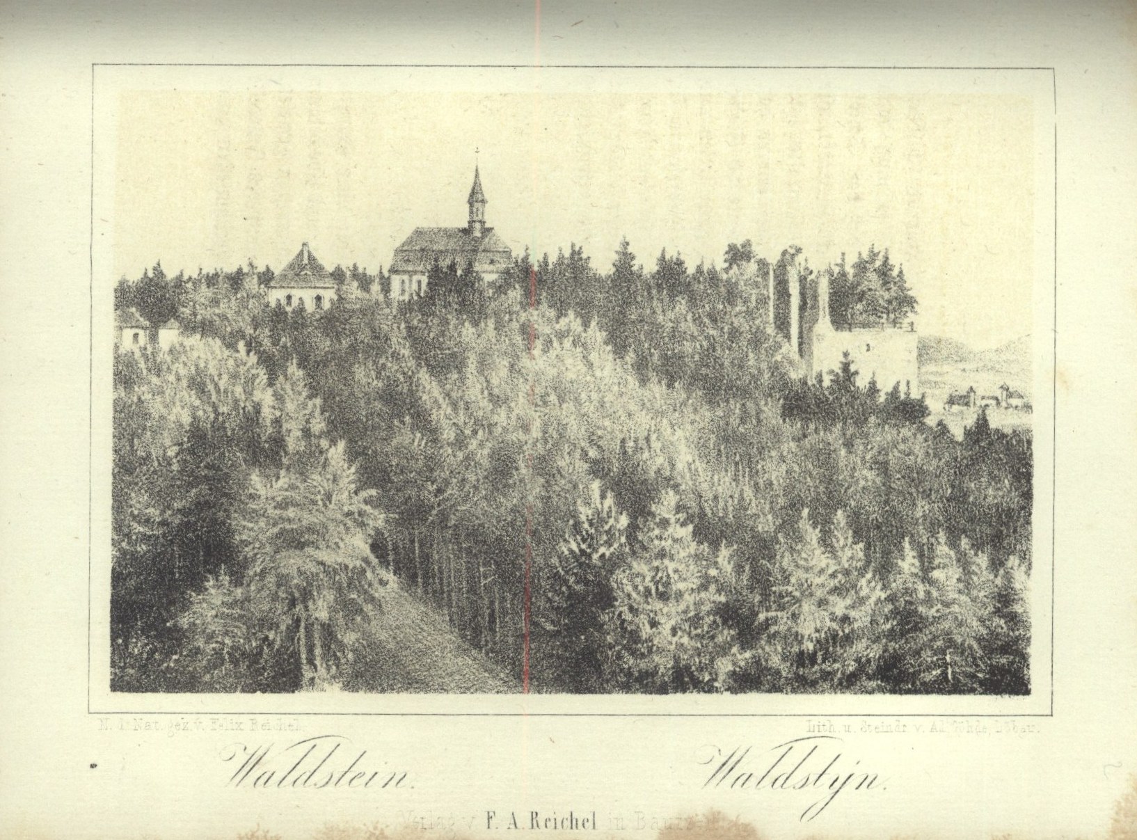 9 litografických příloh, některé s barevným pozadím, zhotovených většinou Adolfem Göhdem v Lobavě podle předloh Felixe Reichela a vydané firmou F.A. Reichel v Budyšíně, vesměs signovaných "N[ach]. d[er]. Nat[ur]. gez[ieret]. v[on]. Felix Reichel - Lith[ographie]. & Steindr[uck]. v[on]. A[dolph]. Göhde, Löbau - Verlag v[on]. F.A. Reichel in Bautzen" zobrazujících lázně Sedmihorky "Wartenberg Sedmyhorské lazne" (frontispis mezi s. [1]-I), zámek Hrubou Skálu "Gross Skal Hruba Skála" (bez údaje o litografu, barevné pozadí, mezi s. 90-91), hrad Valdštejn "Waldstein Waldstýn" (barevné pozadí, mezi s. 110-111), hrad Trosky "Ruine-Trosky Trosky" (N[ach]. ein Orig[ina]l Gemälde - Lith[ographie]. & Steindr[uck]. v[on]. A[dolph]. Göhde, Löbau - Verlag v[on]. F.A. Reichel in Bautzen", barevné pozadí, mezi s. 116-117), město Turnov "Turnau Turnov" (barevné pozadí, mezi s. 124-125), zámek Malá Skála "Klein Skal Malá Skála" (barevné pozadí, mezi s. 164-165),