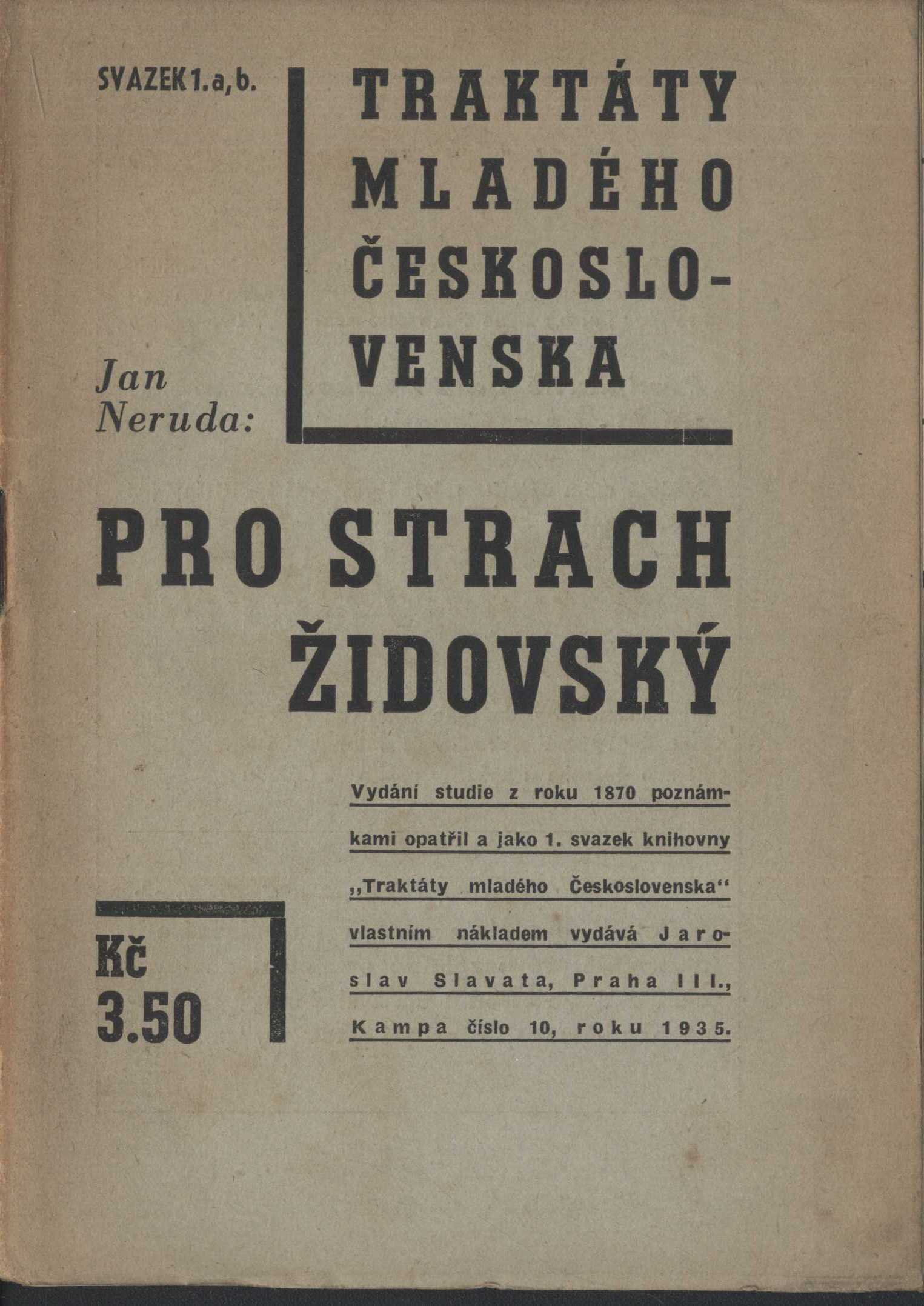 Title information Pro strach židovský : politická studie / Jan Neruda Personal name Neruda, Jan, 1834-1891 (Author) Další autoři Slavata, Jaroslav (Publisher) (Author of introduction) Corporation Grafické závody V. a A. Janata (Printer) Publication Praha : Jaroslav Slavata, 1935 Manufacture Grafické závody V. & A. Janata ) Scope 30 s. ISBN brož. Edition Traktáty mladého Československa sv. 1 a, b