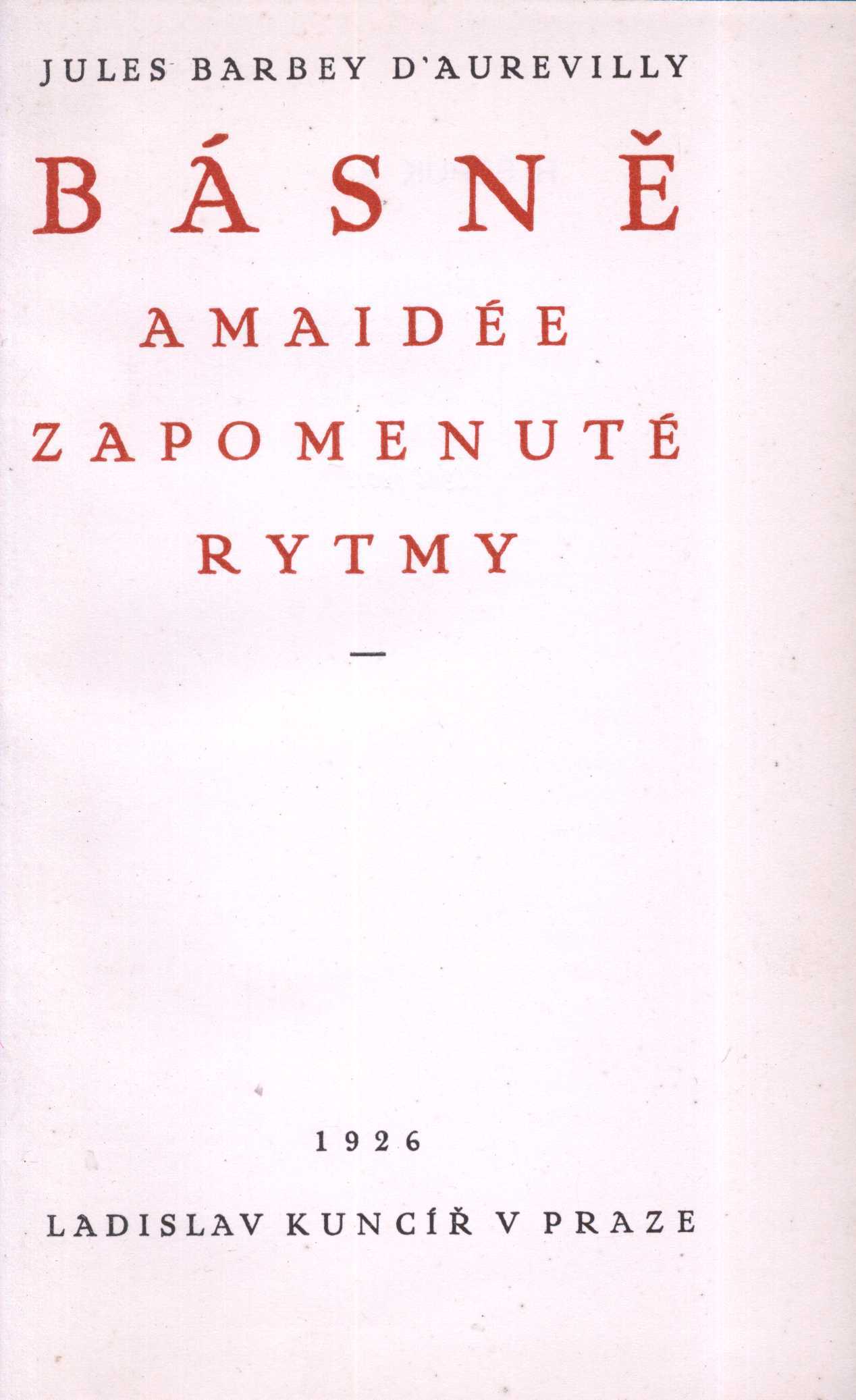 Title information Básně ; Amaidée ; Zapomenuté rytmy / Jules Barbey d'Aurevilly ; [Básně přeložil Zdeněk Hobzík ; Amaidée, Zapomenuté rytmy přeložila St. Jílovská ; upravil V. H. Brunner ; vytiskl F. Obzina] Personal name Barbey d'Aurevilly, Jules Amédée, 1808-1889 (Author) Další autoři Jílovská, Staša, 1898-1955 (Translator) Hobzík, Zdeněk, 1900-1969 (Translator) (Dedicator) Brunner, Vratislav Hugo, 1886-1928 (Graphic technician) Kuncíř, Ladislav, 1890-1974 (Publisher) Obzina, František, 1871-1927 (Printer) Corporation Nakladatelská společnost Rozmach (nakladatelství) (Publisher) Ladislav Kuncíř (nakladatelství a knihkupectví) (Publisher) František Obzina (tiskárna, nakladatelství) (Printer) Publication Praha : Ladislav Kuncíř, 1926 Manufacture F. Obzina) Scope 116 s. ; 20 cm ISBN (váz.) Edition Jules Barbey d'Aurevilly : spisy 8
