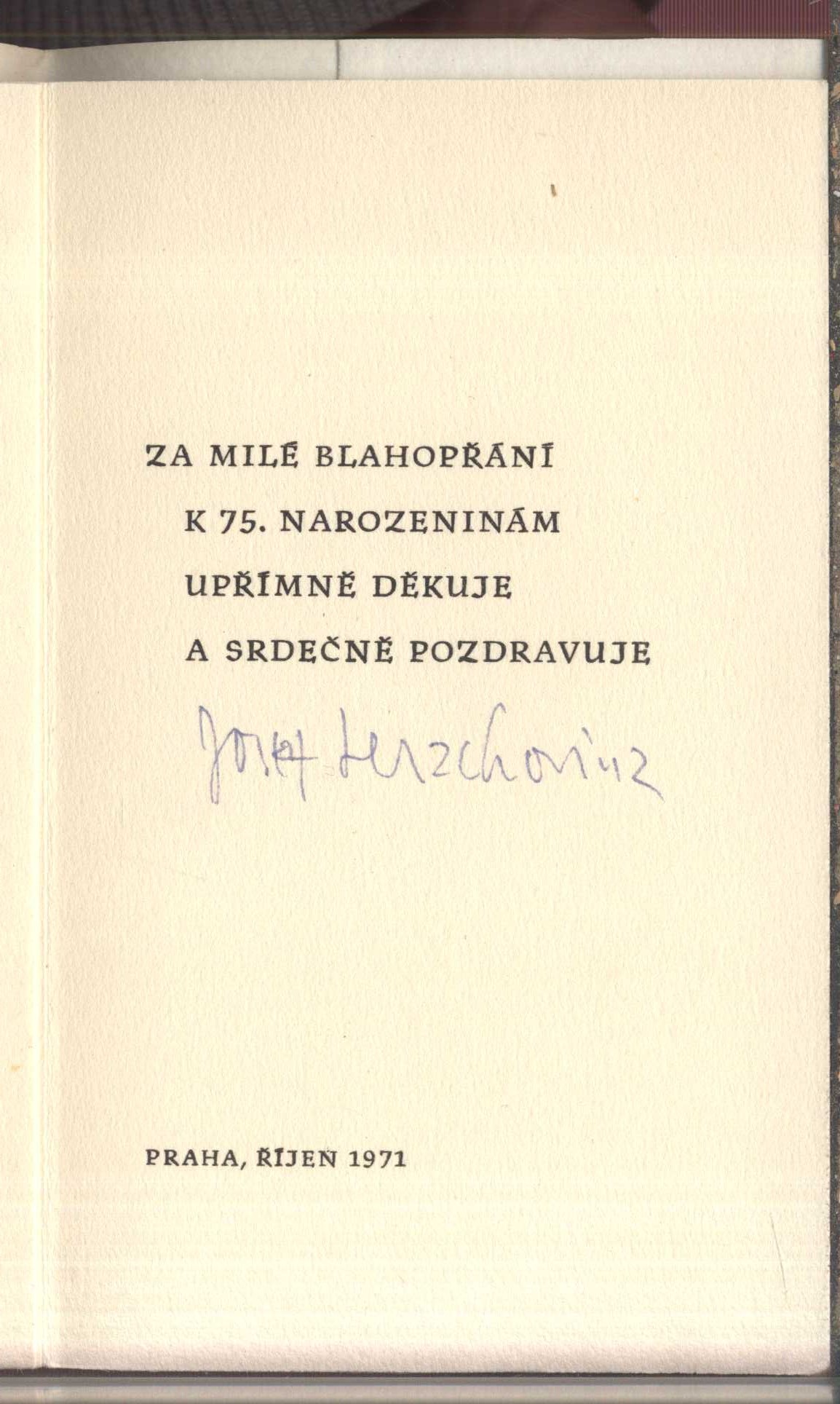 Title information Rozmluva s osudem / Petr Bezruč Personal name Bezruč, Petr, 1867-1958 (Author) Další autoři Hrachovina, Josef, 1896-1975 (Publisher) Publication Praha : [Josef Hrachovina], 1971 Scope 8 nečíslovaných stran Country Czech Republic Language Czech Note Slepá obálka. - Japonská skládaná vazba. - Vytištěné poděkování za blahopřání k 75. narozeninám rukopisně podepsaná Josefem Hrachovinou. - Poznámky.