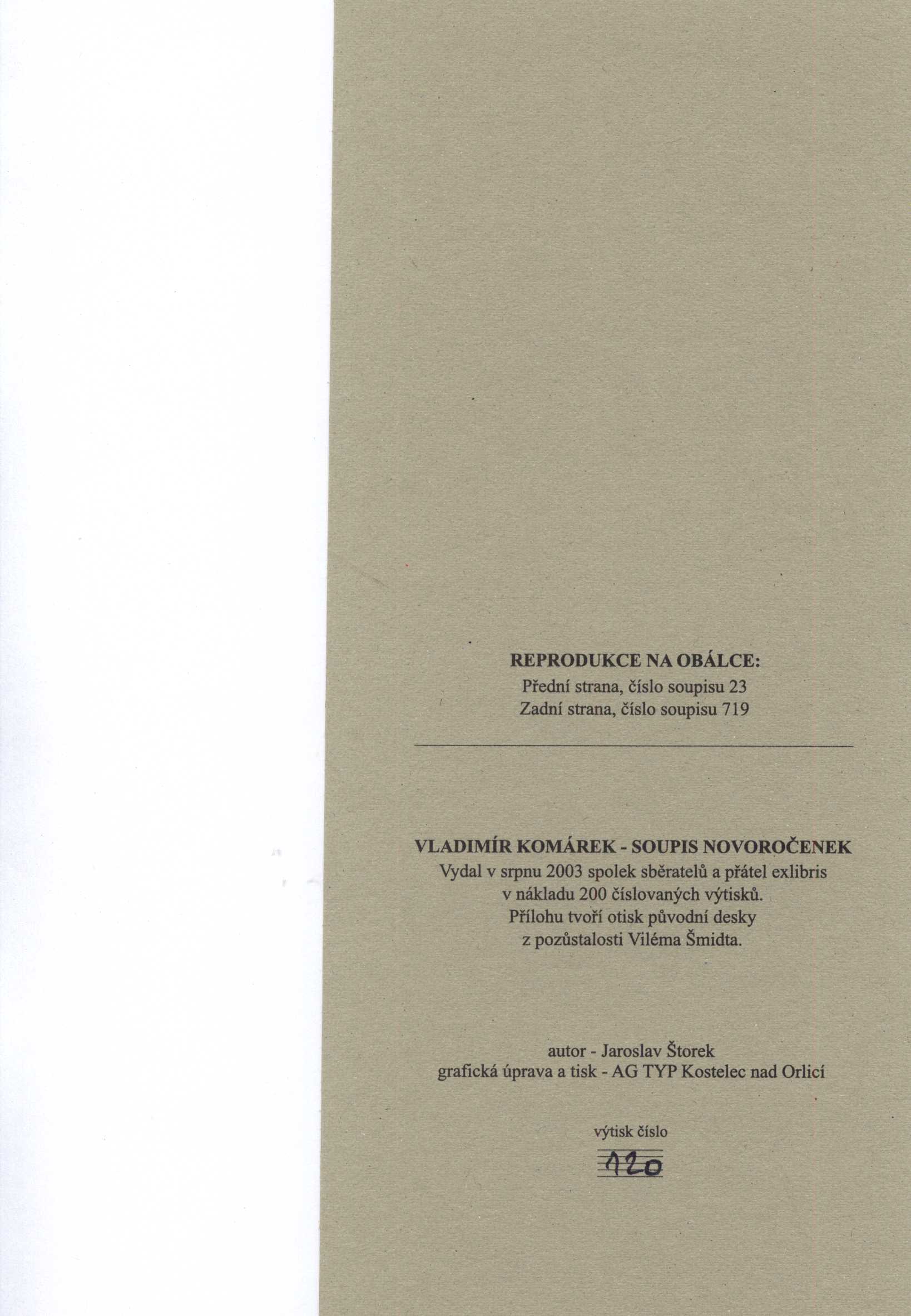 Title information Vladimír Komárek : soupis novoročenek / autor Jaroslav Štorek Personal name Komárek, Vladimír, 1928-2002 (Bookplate designer) (Illustrator) (Artist) Další autoři Štorek, Jaroslav (Compiler) (Author) Corporation Spolek sběratelů a přátel exlibris (Publisher) AG TYP (tiskárna) (Printer) Publication Praha : SSPE, 2003 Manufacture Kostelec nad Orlicí : AG TYP Scope 31 stran : ilustrace ; 21 cm + 1 grafický list Personal subjects Komárek, Vladimír, 1928-2002 - malíř, grafik, ilustrátor, pedagog Keywords česká grafika * drobná grafika * novoročenky * Česko * stol. 20.-21. * soupisy Copy cnt. 1, currently available 1 Document kind monografie Call number C12b 18883