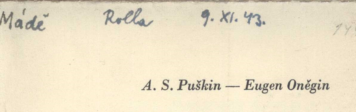 Title information Eugen Oněgin : román ve verších / A.S. Puškin ; přeložil Josef Hora Personal name Puškin, Aleksandr Sergejevič, 1799-1837 (Author) Další autoři Hora, Josef, 1891-1945 (Translator) Sutnar, Ladislav, 1897-1976 (Book designer) Corporation Melantrich (nakladatelství : 1910-1950) (Publisher) (Printer) Edition statement Druhé vydání Publication V Praze : Melantrich, 1940 Scope 265 stran ; 21 cm ISBN (Brožováno) Edition Vybrané spisy A.S. Puškina ; svazek druhý