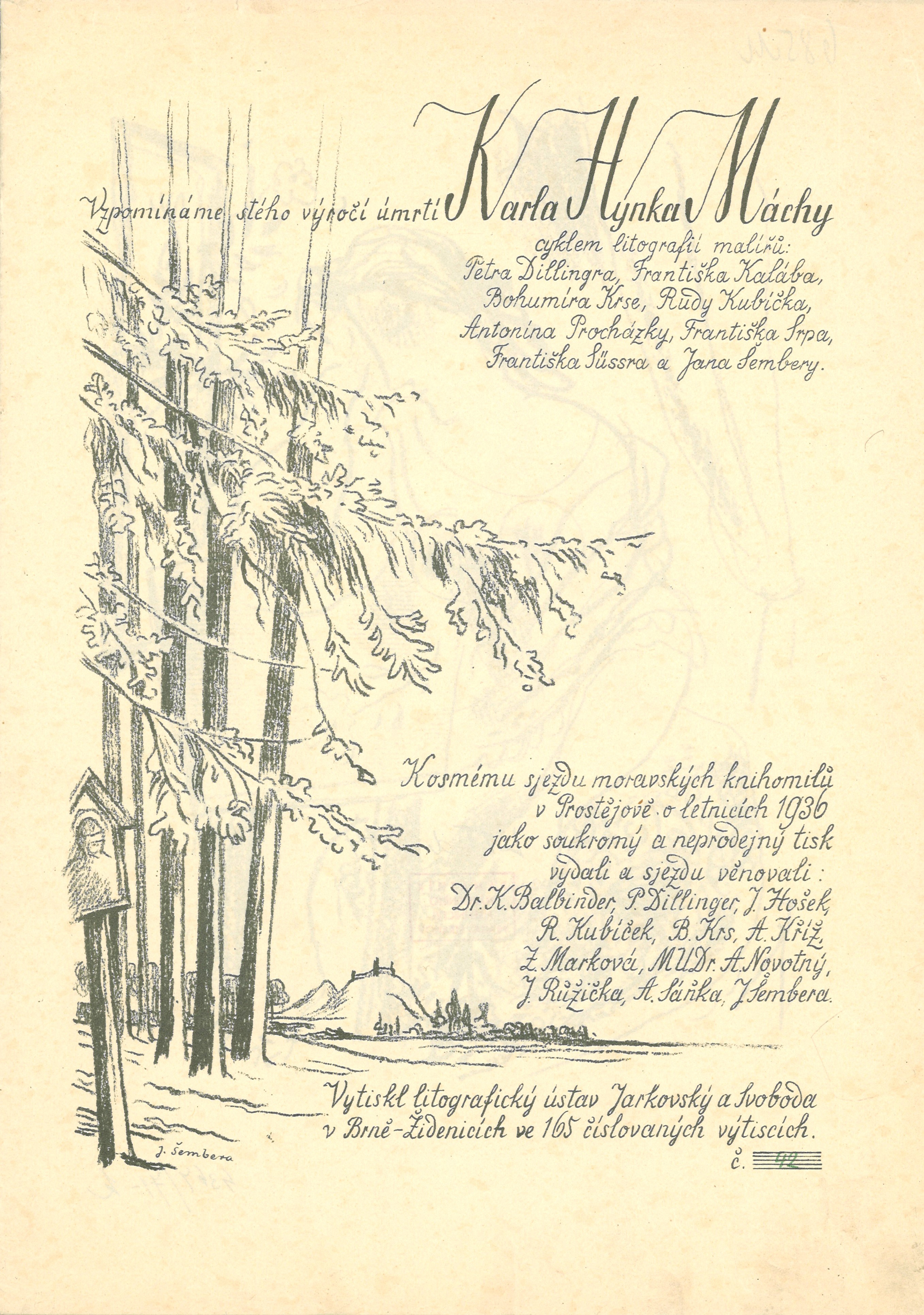Vzpomínáme stého výročí úmrtí Karka Hynka Máchy cyklem litografií malířů: Petra Dillingra, Františka Kalába, Bohumíra Krse, Rudy Kubíčka, Antonína Procházky, Františka Srpa, Františka Süssra a Jana Šembery