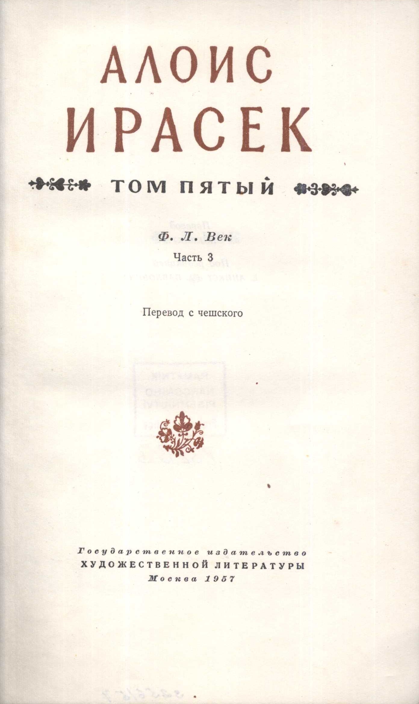 Title information F.L. Vek. Časť 3 / Alois Irasek ; perevod s češskogo N. Krikun ; kommentarii B. Šuplecova Personal name Jirásek, Alois, 1851-1930 (Author) Další autoři Šuplecov, B. (Commentator) Krikun, N. (Translator) Corporation Gosudarstvennoje izdatel‘stvo chudožestvennoj literatury (nakladatelství) (Publisher) Publication Moskva : Gosudarstvennoje izdatel‘stvo chudožestvennoj literatury, 1957 Manufacture 3-ja tipografija Krasnyj proletarij Glavpoligrafproma ministerstva kul'tury SSSR Scope 506 stran ; 20,5 cm Edition Sočinenija v vos'mi tomach / Jirásek Alois ; Tom 5