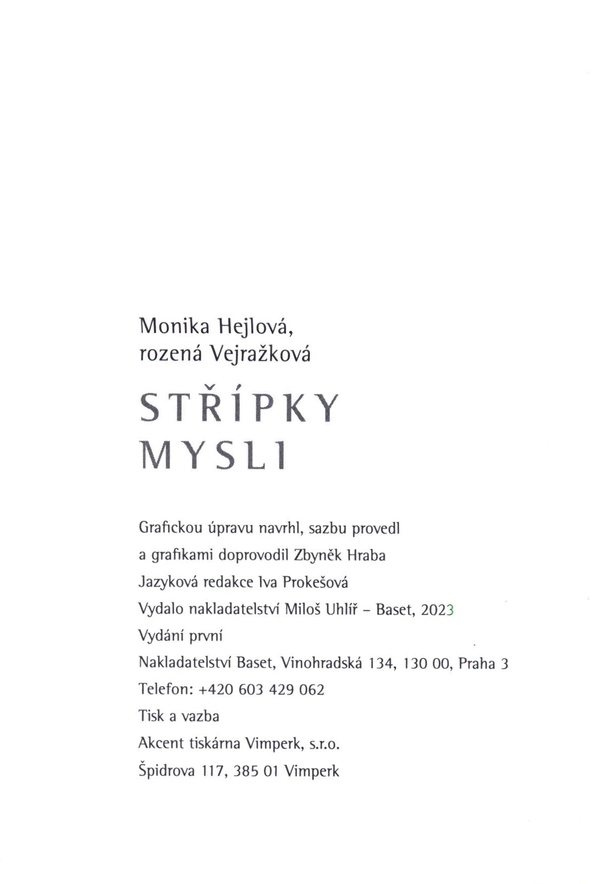 Title information Střípky mysli / Monika Hejlová, rozená Vejražková ; ilustrace Zbyněk Hraba Personal name Hejlová, Monika, 1990- (Author) Další autoři Hraba, Zbyněk, 1960- (Illustrator) Corporation Baset (nakladatelství) (Publisher) Akcent tiskárna Vimperk (Printer) Publication Praha : Baset, 2023 Manufacture Vimperk : Akcent tiskárna Vimperk, s.r.o. Scope 125 stran ; ilustrace ; 18 cm ISBN 978-80-7340-214-3 (Vázáno) Country Czech Republic Language Czech Note Zdobená vazba bez přebalu. - Černobílé ilustrace, na obálce barevné. - Frontispis. - Úvod autorky