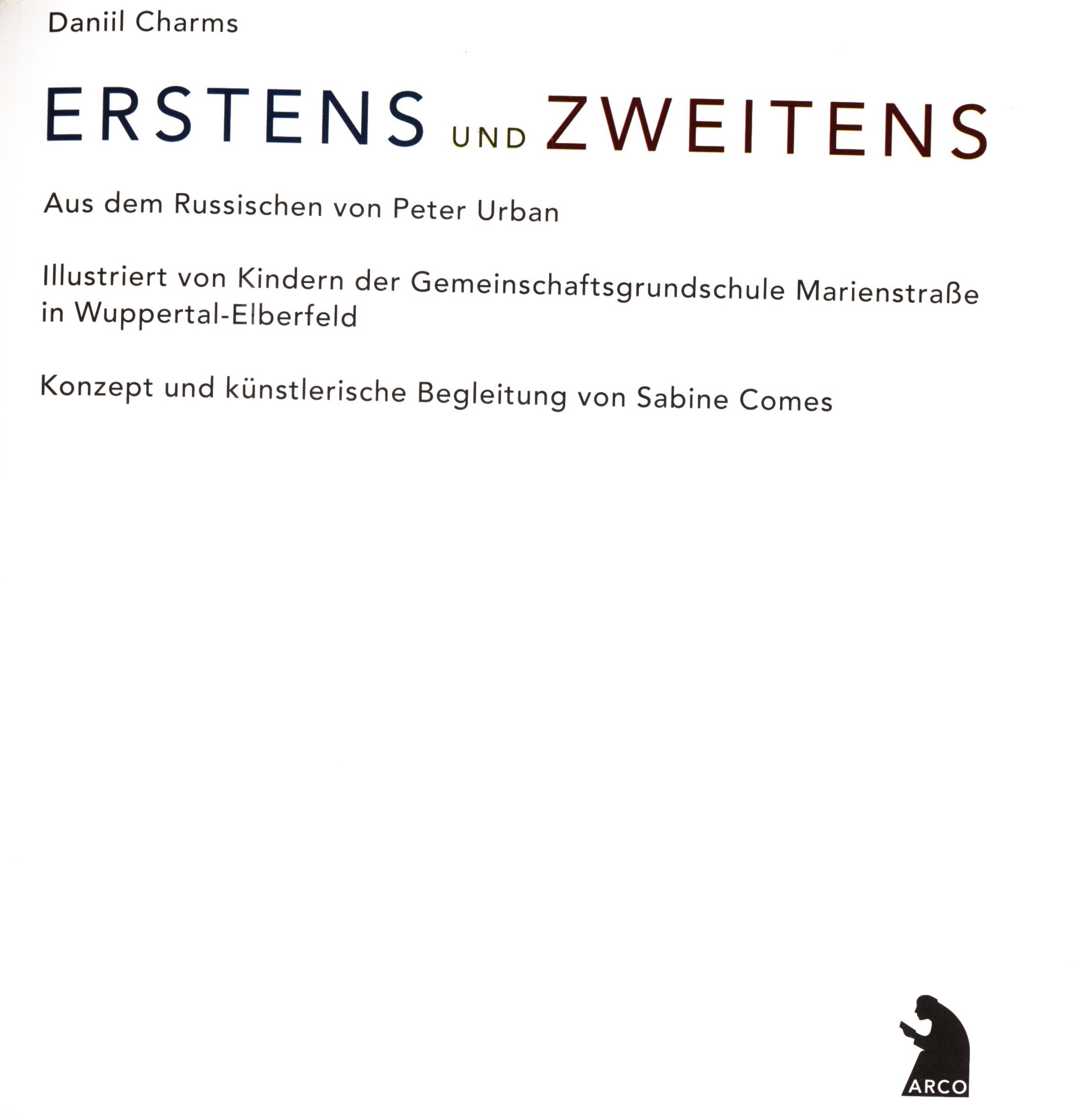 Title information Erstens und Zweitens / Daniil Charms ; aus dem Russischen von Peter Urban ; illustriert von Kindern der Gemeinschaftsgrundschule Marienstraße in Wuppertal-Elberfeld ; Konzept und künstlerische Begleitung von Sabine Comes Personal name Charms, Daniil Ivanovič, 1905-1942 (Author) Další autoři Urban, Peter, 1941-2013 (Translator) Comes, Sabine (Other) Corporation Arco Verlag (Publisher) Gemeinschaftsgrundschule Marienstraße in Wuppertal-Elberfeld (Illustrator) Edition statement Erste Auflage Publication [Wuppertal] : Arco Verlag, [2006] Scope 40 nečíslovaných stran : ilustrace ; 21 cm ISBN 978-3-938375-18-1 (brožováno) Country Germany Language German Note Zdobená obálka. - Doslov. - Poznámka o projektu