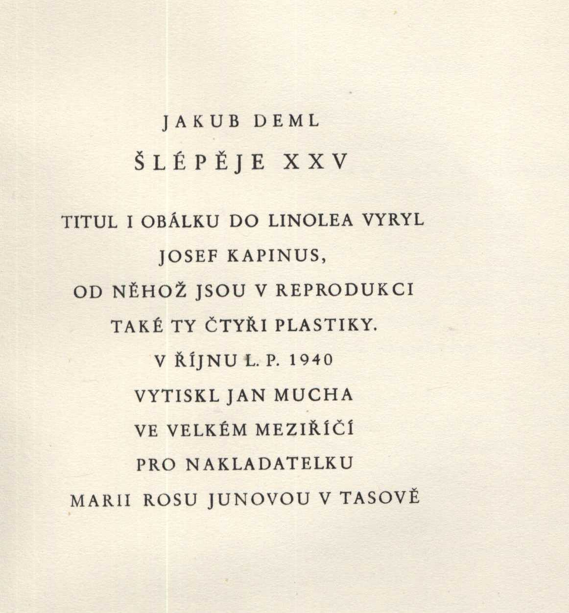Title information Šlépěje : XXV / Jakub Deml ; [titul i obálku do linolea vyryl Josef Kapinus, od něhož jsou v reprodukci také čtyři plastiky] Personal name Deml, Jakub, 1878-1961 (Author) Další autoři Kapinus, Josef, 1900-1968 (Illustrator) (Bookjacket designer) Deml, Jakub, 1878-1961 (Inscriber) Corporation Nakladatelství Marie Rosy Junové (Publisher) Jan Mucha (Velké Meziříčí) (Printer) Edition statement [1. vyd.] Publication Tasov : Marie Rosa Junová, 1940 Manufacture Jan Mucha) Scope 165 s., [4] obr. příl. ISBN brož. Country Czech Republic Language Czech Language of the original German Note Ilustrace na obálce a titulním listu. - Na záložkách obálky nakladatelská inzerce. - V příloze fotografie plastik J. Kapinuse. - Částečně německý text.