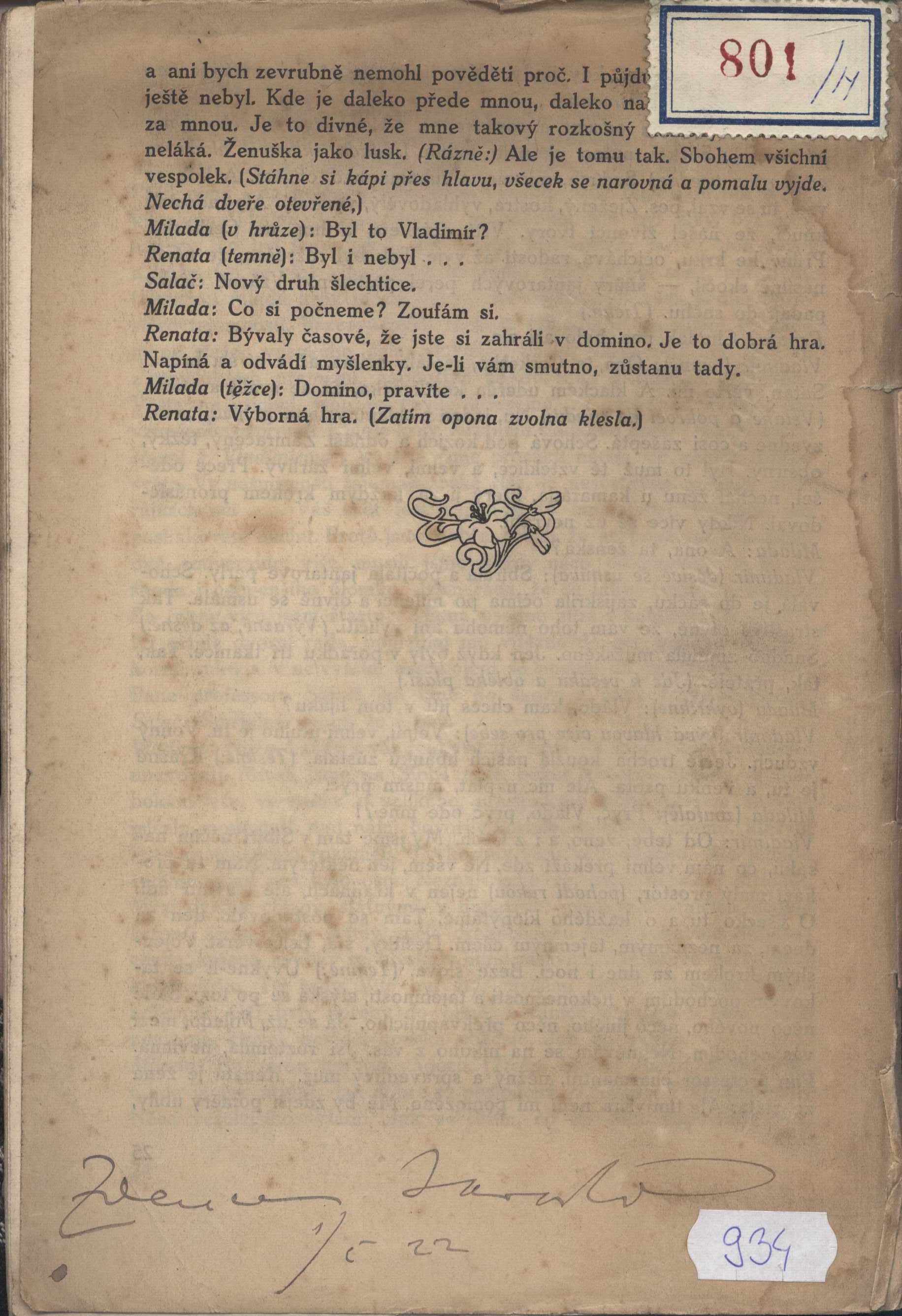 Annotation (hbzb) Document kind monografie Keywords česká literatura * stol. 20., léta 20. * české drama * divadelní hra UDC 821.162.3 * 821.162.3-2 Former owners Braunerová, Zdenka, 1858-1934 Dolenský, Antonín, 1884-1956 Braunerová Zdenka 1858-1934 Dolenský Antonín 1884-1956 Uživatelské pole PNP Signatura KaG LXI 383: Původní brož, bez obálky. - Zachovalý stav. Signatura KaG LXI 383: Přírůstkové číslo: 2233/57: dar paní Dolenské (tj. dřívější majitel Antonín Dolenský). Signatura VHB 801: Původní brož, bez obálky. - Exemplář silně špinavý, poslední list vytržen a přiložen. - Poškozeno. Signatura VHB 801: Na poslední straně knihy rukopisná dedikace Jaroslava Marii Zdence Braunerové: "Zdence Jaroslav 1/5 22". Call number Track No. Location Info KaG LXI 383 00xxx/KAG Sbírka VHB 0801 0801/H Sbírka