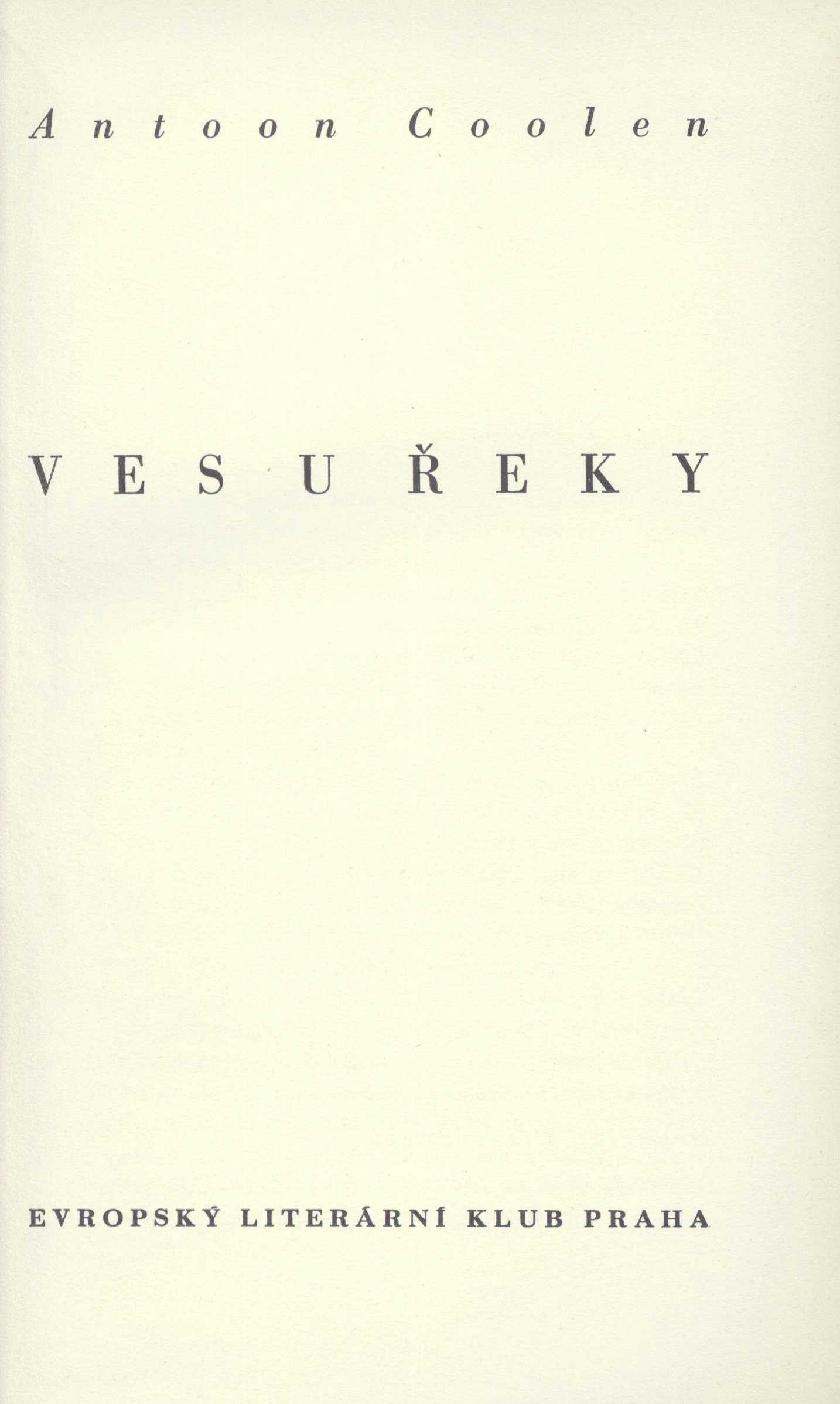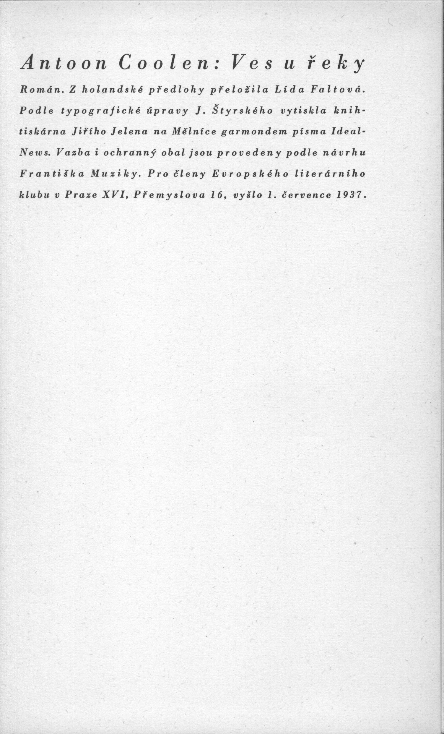 Title information Ves u řeky : [román] / Antoon Coolen ; [z holandské předlohy přeložila Lída Faltová ; podle typografické úpravy J. Štyrského ; vazba i ochranný obal jsou provedeny podle návrhu Františka Muziky] Personal name Coolen, Antoon, 1897-1961 (Author) Další autoři Faltová, Lída, 1890-1944 (Translator) (Author of afterword, colophon, etc.) Štyrský, Jindřich, 1899-1942 (Typographer) Muzika, František, 1900-1974 (Binding designer) Corporation Evropský literární klub (nakladatelství) (Publisher) Jiří Jelen (tiskárna) (Printer) Publication Praha : Evropský literární klub, 1937 Manufacture Na Mělníce : knihtiskárna Jiřího Jelena Scope 218 stra ; 22 cm ISBN vázáno Country Czech Republic Language Czech Language of the original Dutch Note Zdobená barevná plátěná vazba s vytlačenou značkou ELK a tiskem na hřbetě. - Nakladatelská značka na vakátě. - Doslov L. Faltové.