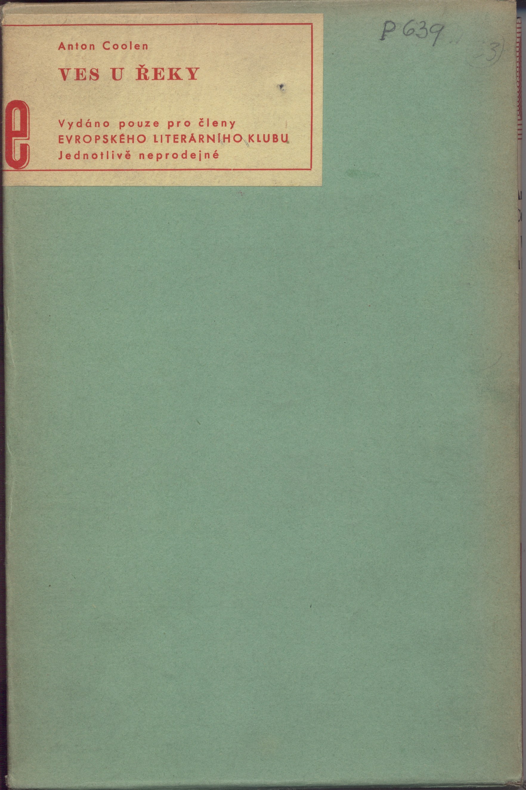 Document kind monografie Translation of Dorp aan de Rivier Keywords překladová literatura * holandská literatura * román * Holandsko UDC (492) * 82-31 * 821.112.5 * =030 Uživatelské pole PNP Kniha se sign. AVrbova 71 - Knihovna Aleny Vrbové. U knihy se sign. AVrbova 71 chybí pův. ochranný obal. U sign. ELK 0096 a ELK 0096a (stejné vázané výtisky) typizovaná, barevná, zdobená obálka (F. Muzika) se značkou nakladatelství. - Plátěná vazba s barevnou ražbou (F. Muzika). - Na přední záložce a zadní straně obálky výroky o díle autora. - Na přední předsádce razítko Archiv Čs. spisovatel, č. P 639. - Nakladatelská značka. - Patitul. - Titulní list. - Doslov (L. Faltová). - Tiráž. - Na zadní záložce upoutávka na členství v ELKu. - Typizované kartonové pouzdro s nalepeným informačním štítkem a značkou. Tiráž: "Antoon Coolen: Ves u řeky. Román. Z holandské předlohy přeložila Lída Faltová. Podle typografické úpravy Jindřicha Štyrského vytiskla knihtiskárna Jiřího Jelena na Mělníce garmondem písma Ideal-News. Vazba i ochranný obal jsou provedeny podle návrhu Františka Muziky. Pro členy Evropského literárního klubu v Praze XVI, Přemyslova 16, vyšlo 1. července 1937." Rozsah: 218, [6] s. Rozměr knihy: 21,6 cm; rozměr pouzdra: 22,4 cm Sign. Branald 0137 - Knihovna A. Branald. - Chybí papírové pouzdro. Sken ELK0096 je totožný se signaturou Branald 0137. Originál: Dorp aan de Rivier vyšel v roce 1934. Call number Track No. Location Info AVrbova 071 1604/2009 Sbírka ELK 0096 2322/2012 Sbírka ELK 0096a 2323/2012 Sbírka