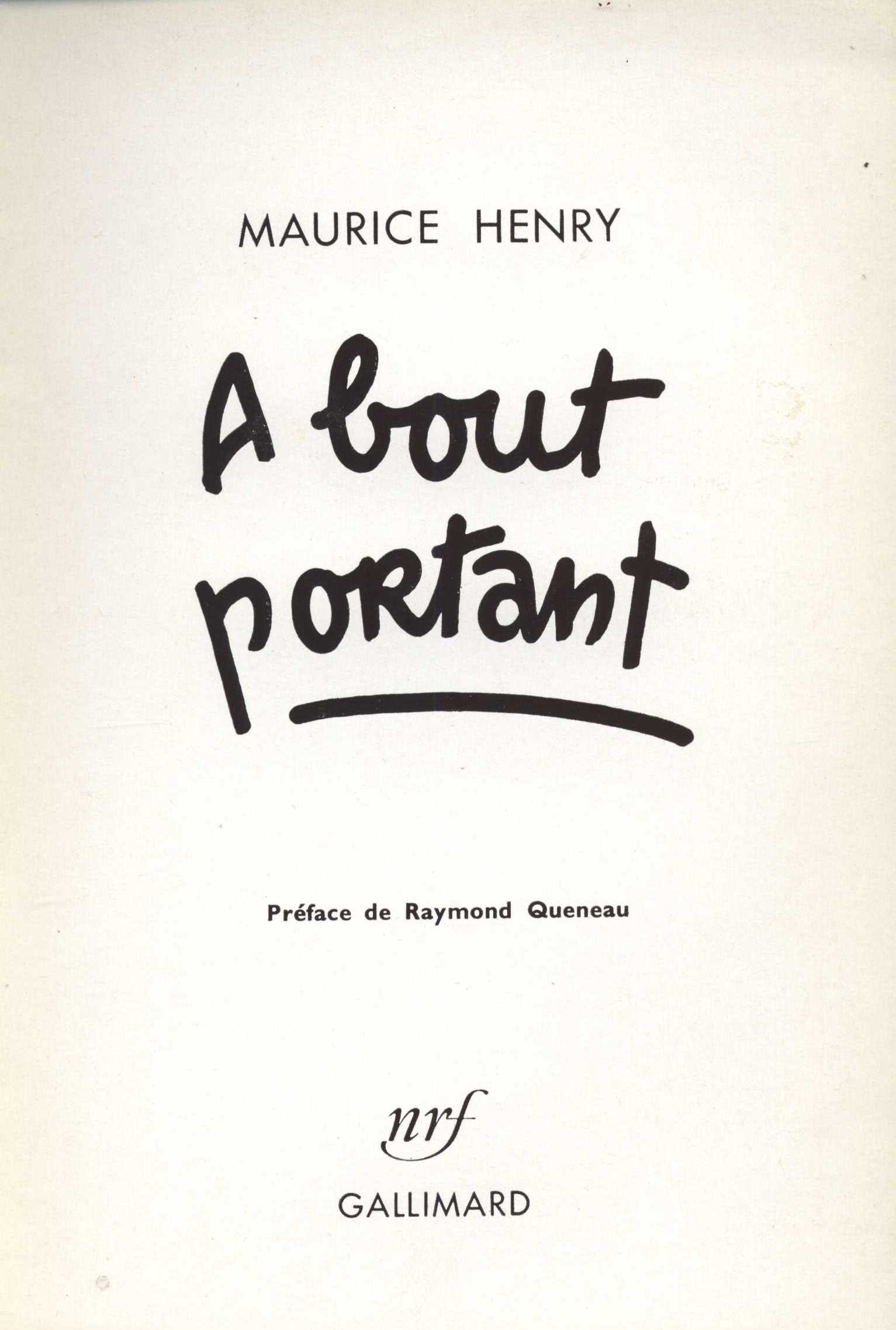 Title information A bout portant / Maurice Henry ; préface de Raymond Queneau Personal name Henry, Maurice, 1907-1984 (Author) Další autoři Queneau, Raymond, 1903-1976 (Author of introduction) Corporation Librairie Gallimard (Paříž, Francie) (Publisher) Publication Paris : Gallimard, c1958 Scope 93 s. : il. ISBN brož. Country France Language French Note Zdobená obálka. - Černobílé celostránkové ilustrace. - Seznam vyobrazení. - Na obálce: 85 portraits charges littéraires.