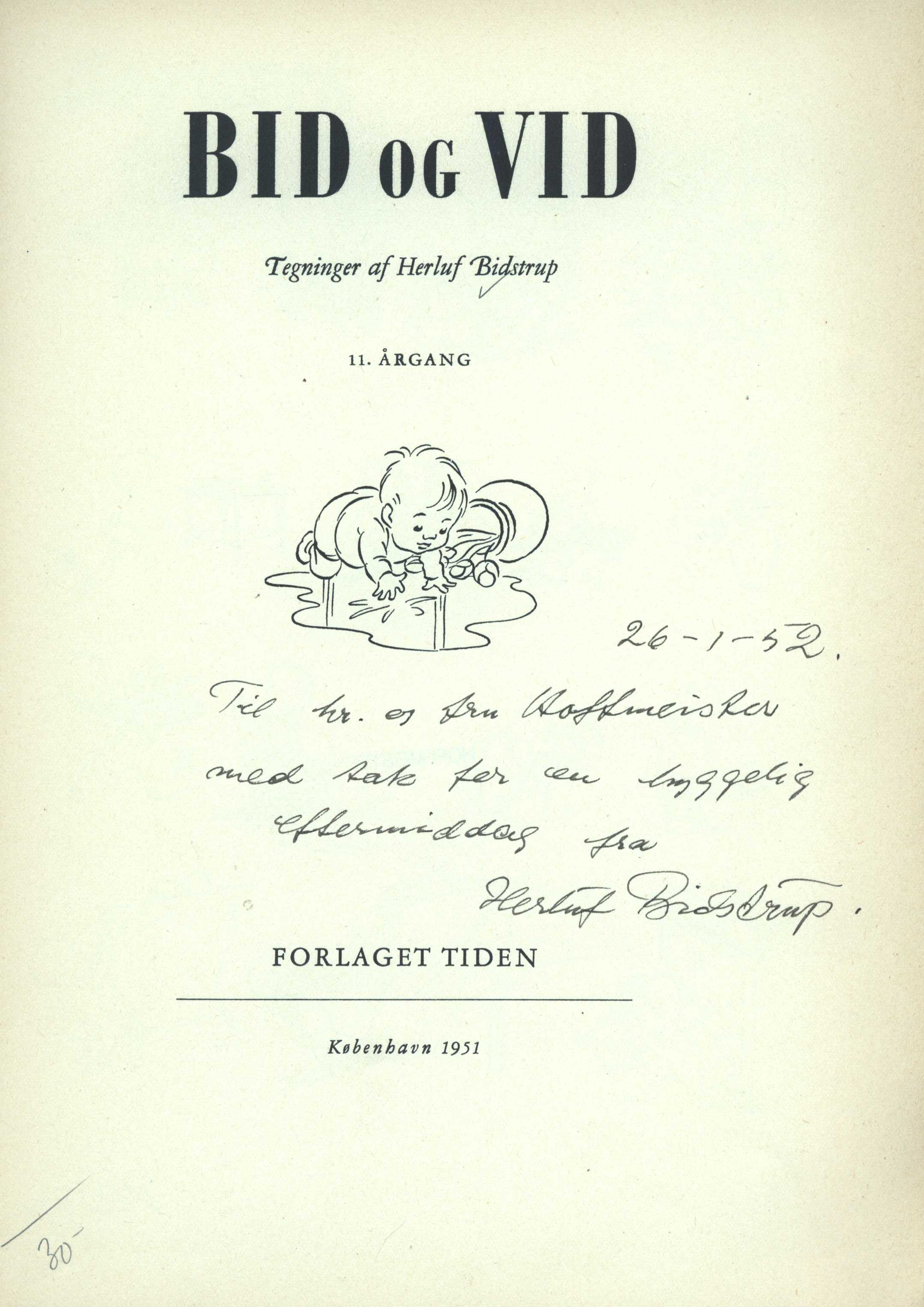 Title information Bid og Vid : tegninger af Herluf Bidstrup. 11. årgang Personal name Bidstrup, Herluf, 1912-1988 (Author) (Dedicator) Publication København : Forlaget Tiden, 1951 Scope [22] l. ISBN brož. Country Denmark Language Danish Note Zdobená obálka. - Ilustrace na titulním listě. - Černobílé celostránkové ilustrace. - Na zadní straně obálky upoutávka na titul.