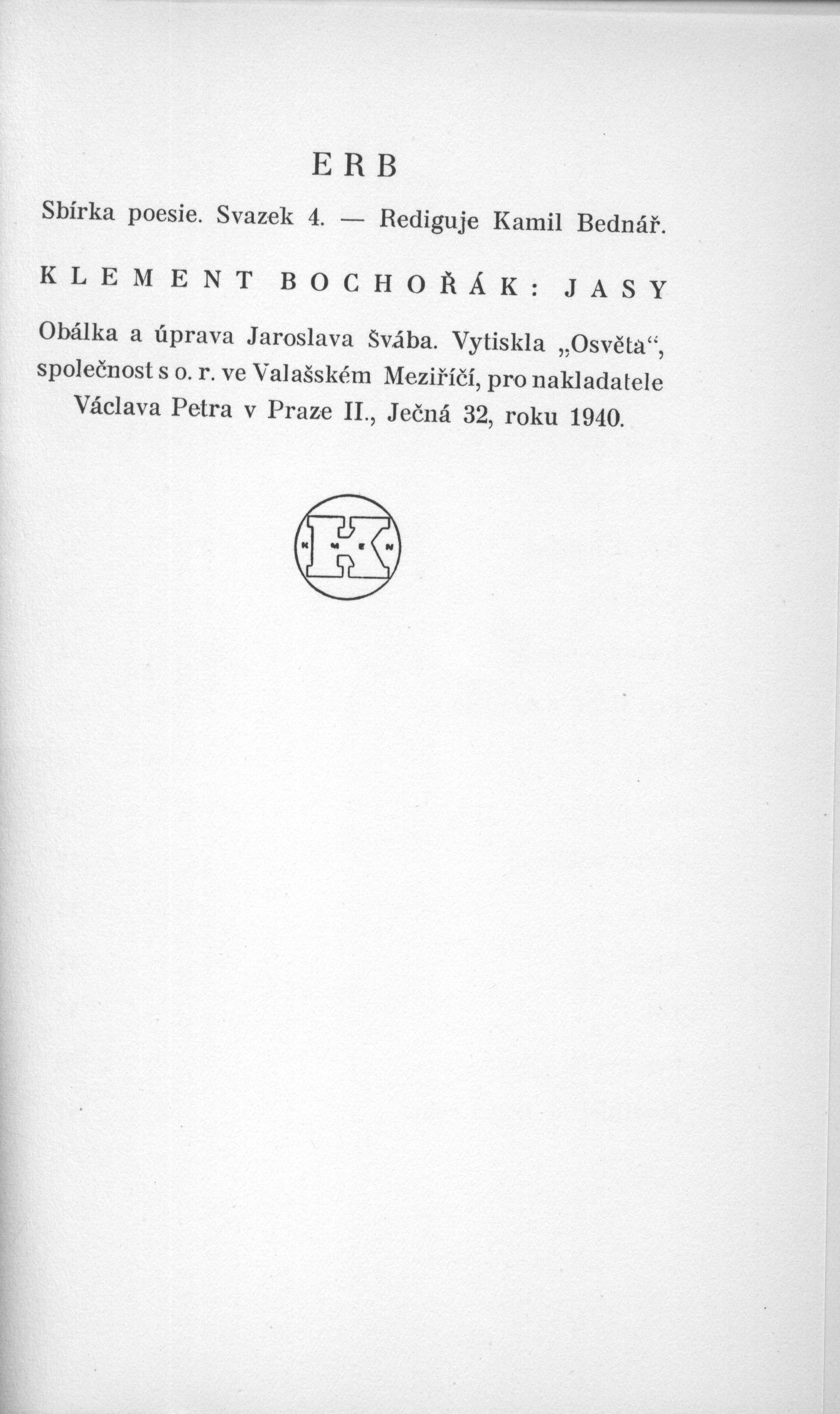 Title information Jasy : básně / Klement Bochořák ; [obálka a úprava Jaroslava Švába] Personal name Bochořák, Klement, 1910-1981 (Author) Další autoři Šváb, Jaroslav, 1906-1999 (Bookjacket designer) (Book designer) Corporation Václav Petr (nakladatelství) (Publisher) Osvěta (tiskárna) (Printer) Publication Praha : Václav Petr, 1940 Manufacture vytiskla „Osvěta“, společnost s o. r.) Scope 47 s. ; 21 cm ISBN brož. Edition Erb : sbírka poesie ; svazek 4