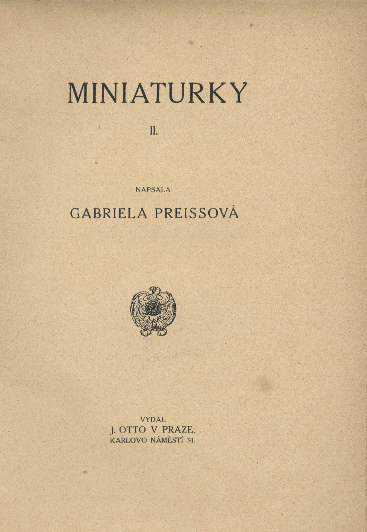 Title information Miniaturky / napsala Gabriela Preissová. [II.] Personal name Preissová, Gabriela, 1862-1946 (Author) Další autoři J. Otto (nakladatelství) (Publisher) Unie (tiskárna) (Printer) Publication V Praze : J. Otto, [1911] Manufacture (Tiskem Unie) Scope 205 s. ISBN (brož.) Edition G. Preissová: Sebrané spisy 6