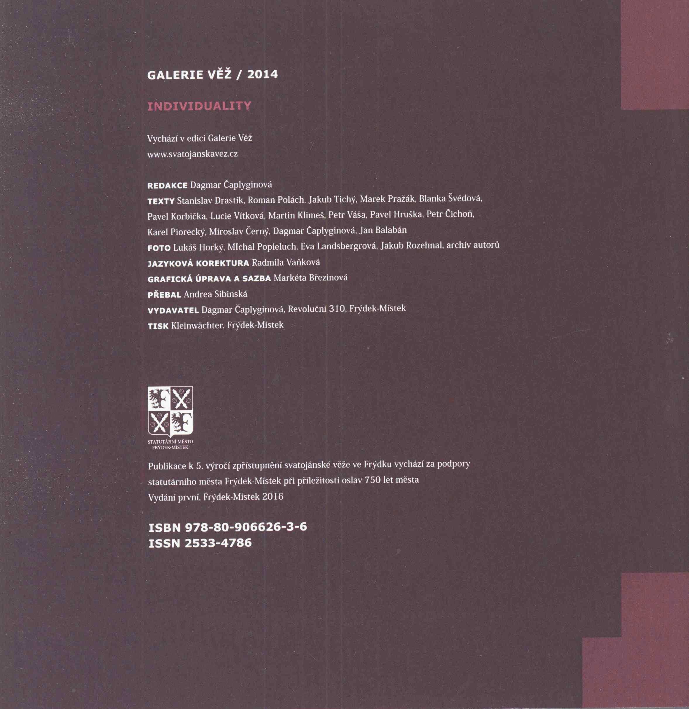 Galerie VěžCountry Czech Republic Language Czech Note Vydáno při příležitosti oslav 750 let Frýdku-Místku. - V knize uvedeno fiktivní ISSN 2533-4786. - Ve společném papírovém obalu s ostatními svazky edice Galerie Věž (svazky 11-15).