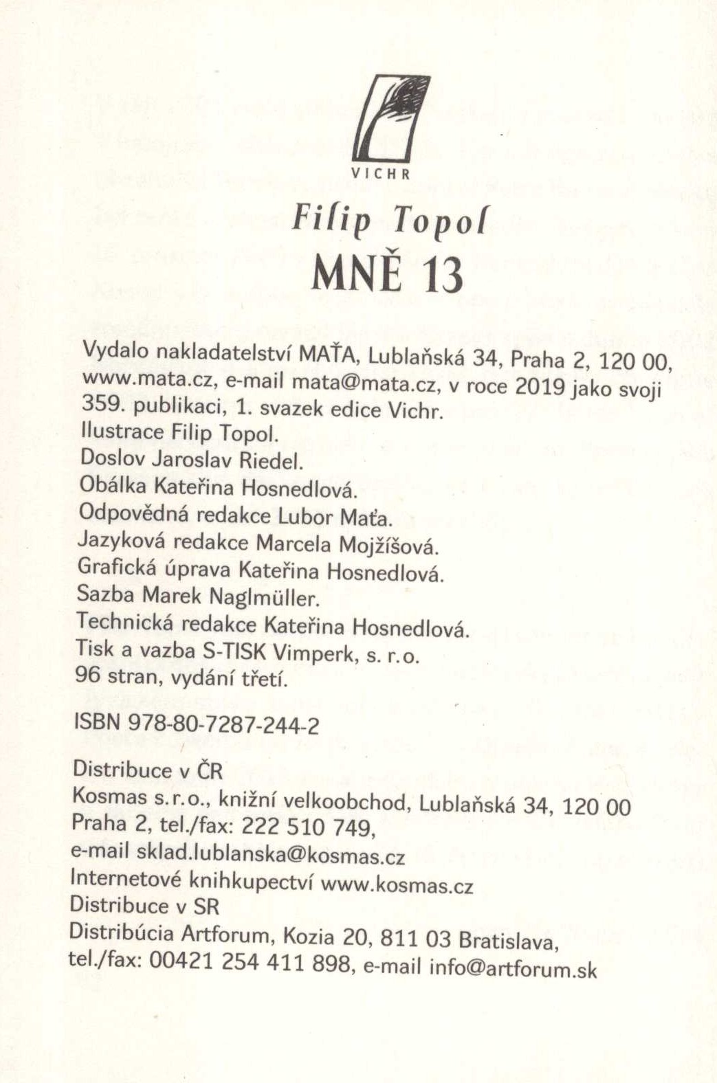 Vichr, (Maťa)Country Czech Republic Language Czech Note Světlá obálka s černobílou ilustrací, dvoubarevný text, nakladatelská značka; šedý hřbet s dvoubarevným textem, ediční a nakladatelská značka. - Na záložkách stručná biografie a bibliografie autora, edice Vichr. - Světlá vazba s černobílou ilustrací, černý text, nakladatelská značka; černý text , ediční a nakladatelskiá značka na hřbetu. - Modré předsádky. - Faksimile podpisu F. Topola. - Ediční značka n apatitulu. - Drobná černobílá ilustrace a nakladatelská značka na titulním listu. - Věnování. - Celostránkoví černobílé ilustrace s textem. - Domluva F. Topol. - Černobílé foto F. Topola. - Doslov "Filip Topol (1965-2013) od J. Riedela. - Ediční značka v tiráži. - Drobná barevná ilustrace na zadní straně obálky. - Přebal.