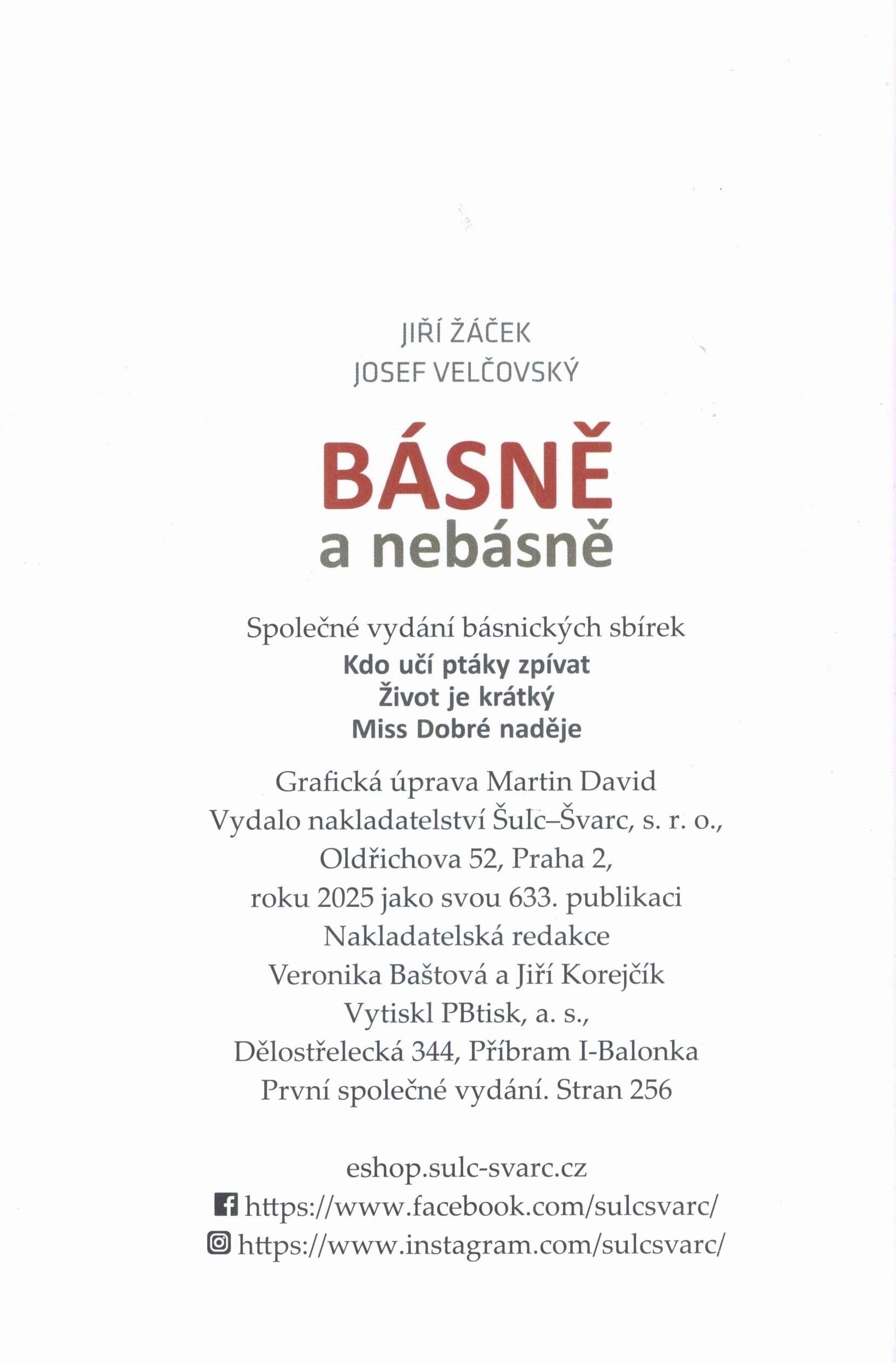 AnnotationReedice tří básnických sbírek Jiřího Žáčka z let 2020-2024 s výrazným ilustračním doprovodem Josefa Velčovského. Všechna tři díla na sebe navazují, vzájemně se doplňují a spojuje je jedinečný výtvarný doprovod. Kniha Básně a nebásně zahrnuje více než 120 ilustrací a obrazů Josefa Velčovského. Tomu vychází vstříc větší formát knihy, aby Velčovského obrazy náležitě vynikly a byly rovnocenné s Žáčkovými básněmi. Nakladatelská anotace. Kráceno.