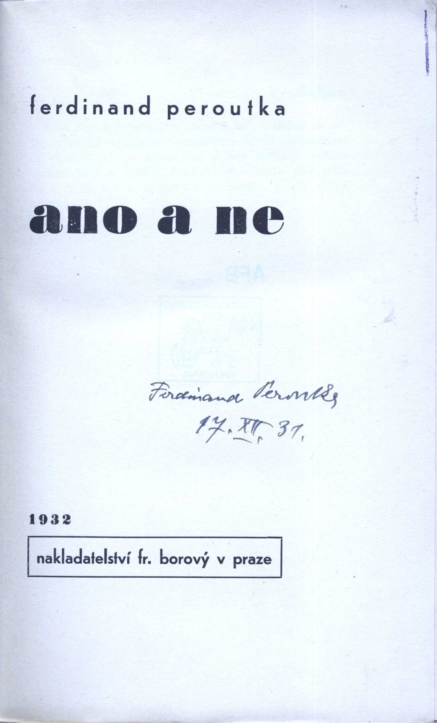 Title information Ano a ne / Ferdinand Peroutka Personal name Peroutka, Ferdinand, 1895-1978 (Author) Další autoři Hoffmeister, Adolf, 1902-1973 (Bookjacket designer) Corporation Fr. Borový (firma) (Publisher) Polygrafia (nakladatelství a tiskárna, Brno) (Printer) Publication V Praze : Fr. Borový, 1932, [spr. 1931] Manufacture Polygrafia) Scope 284 s. ; 8° ISBN brož. Country -cs Language Czech Note Zdobená obálka. - Na záložce poznámka o autorovi. - Nakladatelská značka. - Předmluva. - Na zadní straně obálky nakladatelská upoutávka na knihu F. Peroutky Boje o dnešek.