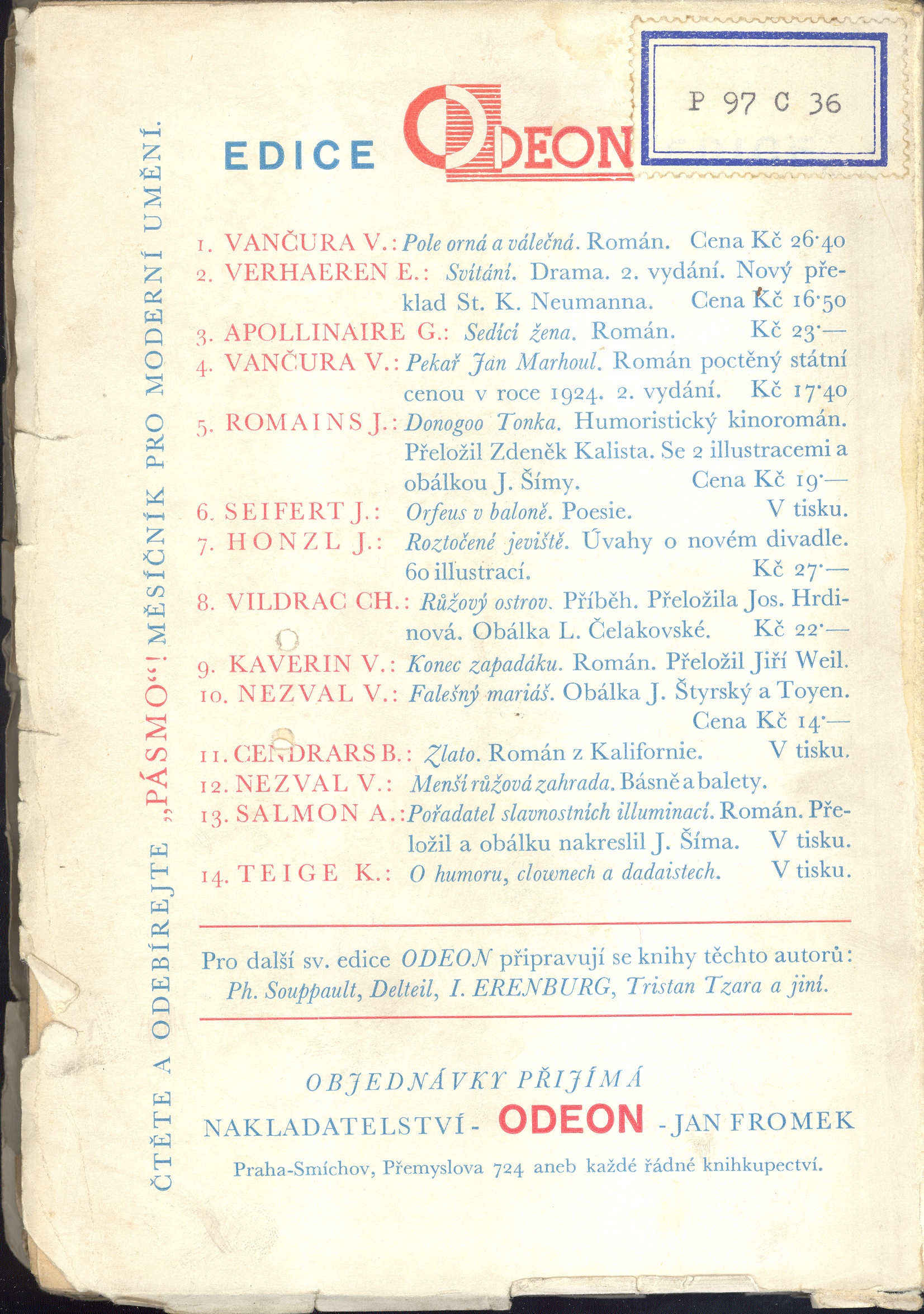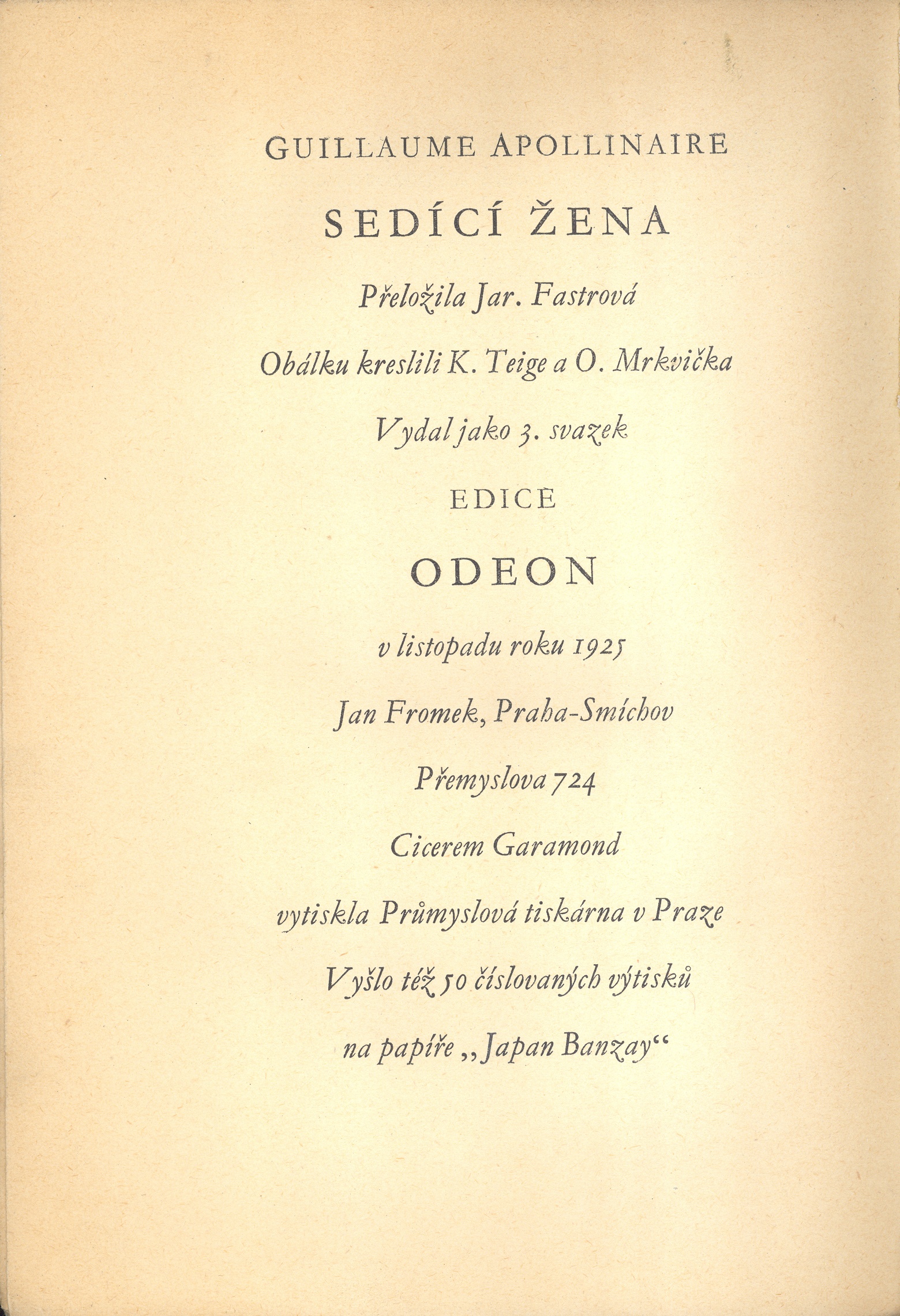 Edice Odeon, (Odeon, Jan Fromek)Country -cs Language Czech Language of the original French Note Vyšlo též 50 číslovaných výtisků na papíře Japan Banzay.