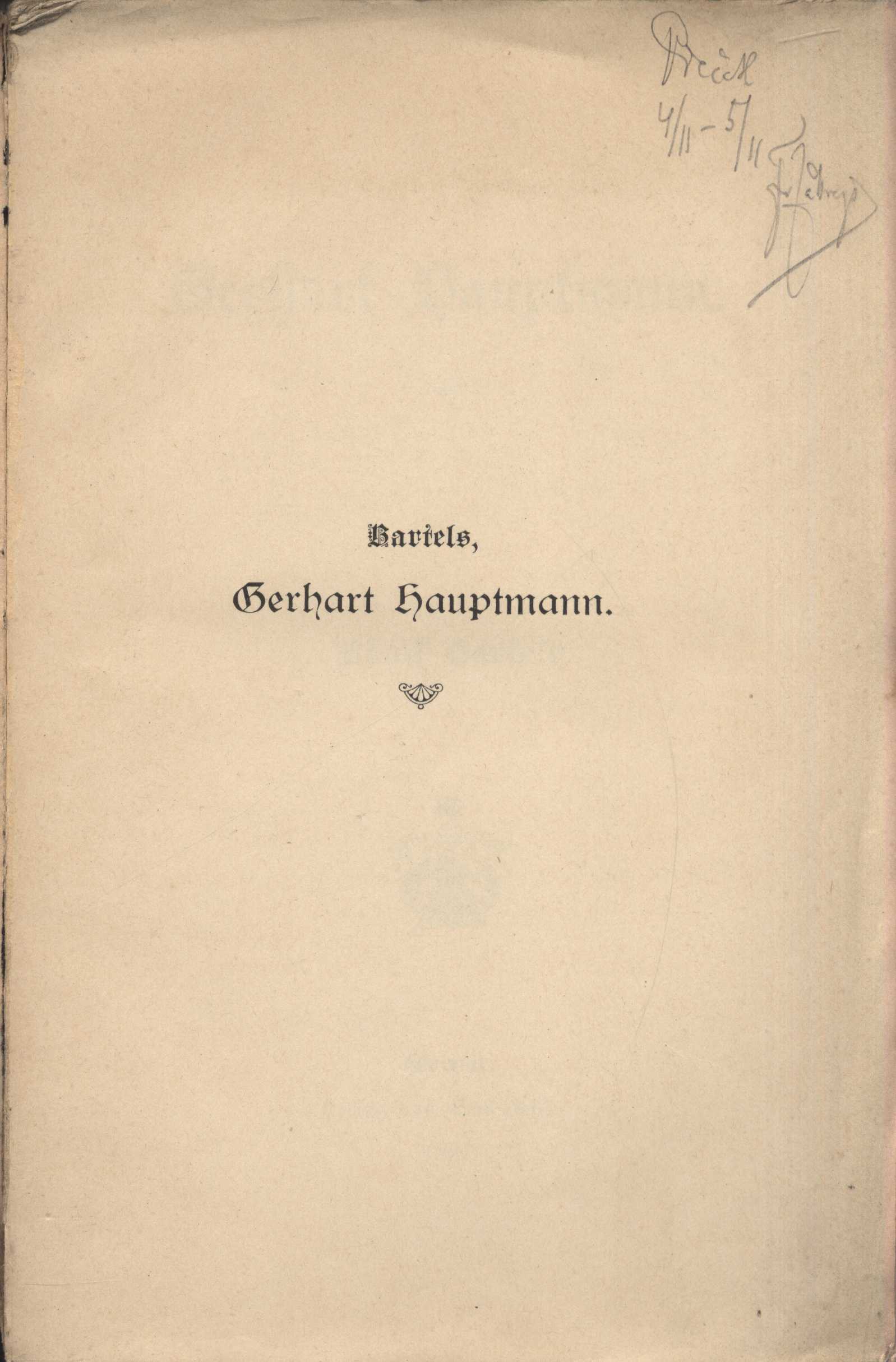 Title information Gerhart Hauptmann / von Adolf Bartels Personal name Bartels, Adolf, 1862-1945 (Author) Další autoři Felber, Emil , 1866-1932 (Publisher) Zákrejs, František, 1839-1907 (Former owner) (Illustrator) Publication Weimar : Emil Felber, 1897 Scope 255 s. ISBN brož. Country Germany Language German Note Na obálce a na titulním listu nakladatelský signet. - Sazba gotikou. - Nakladatelská reklama. - Životopisná tabulka.