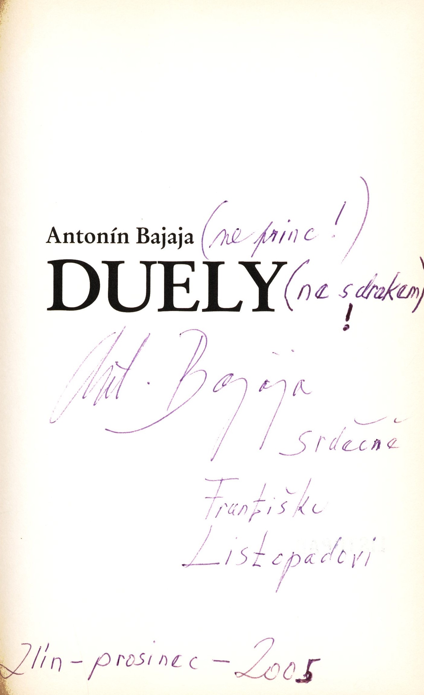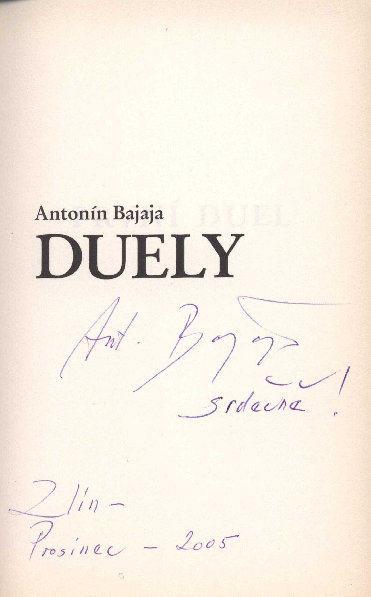 Annotation Rozsáhlá románová freska z valašského prostředí Duely vypráví osudy několika generací kopaničářů, jejichž paměť vlastně vytváří zázemí současnosti. Postižení návazností i proměny v myšlení dědů, otců a synů směřuje k hlavní myšlence díla, jíž je kategorický zákon lidskosti a mravnosti, individuální a společenské odpovědnosti. Document kind monografie Keywords česká próza * románová kronika * kopaničáři * Valašsko UDC 821.162.3-3 * 885.0-31 * 398.1 Uživatelské pole PNP Sign. R&AHamanovi 0723 - Knihovna R. a A. Hamanových. - V knize dedikace s datací (2005). Sign. Listopad 0001: Dedikace na titulním listu "(ne princ) (ne s drakem!) Ant. Bajaja srdečně Františku Listopadovi. Zlín - prosinec 2005". Call number Track No. Location Info R&AHamanovi 0723 1593/2014 Sbírka Listopad 0001 0153/2025 Sbírka