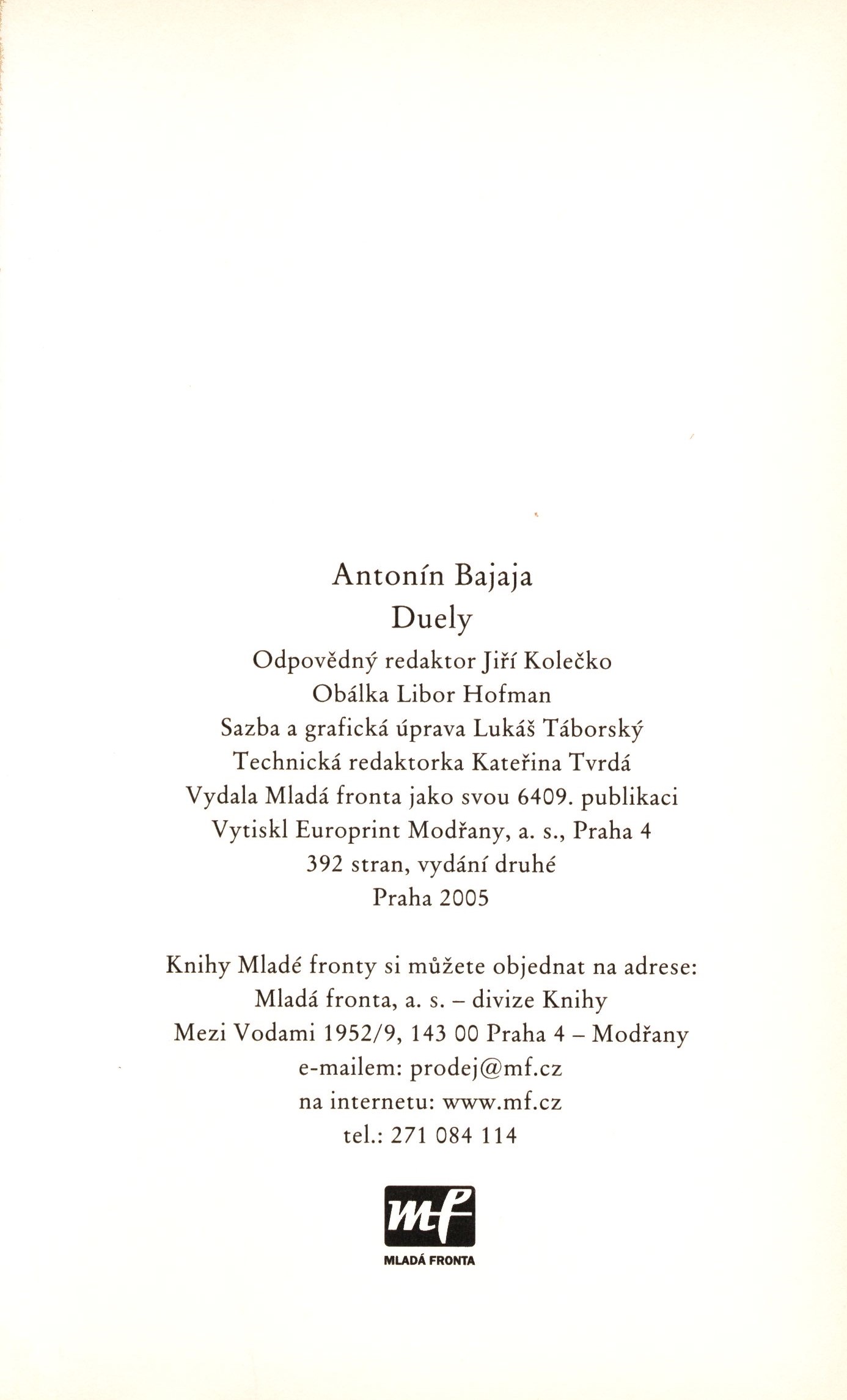 Title information Duely / Antonín Bajaja ; [obálka Libor Hofman ; grafická úprava Lukáš Táborský] Personal name Bajaja, Antonín, 1942-2022 (Author) (Dedicator) Další autoři Hofman, Libor, 1955- (Bookjacket designer) Táborský, Lukáš (Graphic technician) Listopad, František, 1921-2017 (Dedicatee) Corporation Mladá fronta (nakladatelství) (Publisher) Europrint Modřany a. s. (tiskárna) (Printer) Edition statement vydání druhé Publication Praha : Mladá fronta, 2005 Manufacture (Europrint Modřany) Scope 387 stran ; 21 cm ISBN (vázáno) 80-204-1323-5 Country Czech Republic Language Czech Note Ilustrace na přebalu a vazbě. - Na záložce přebalu poznámka o knize a autorovi. -Titulní list. - Tiráž.