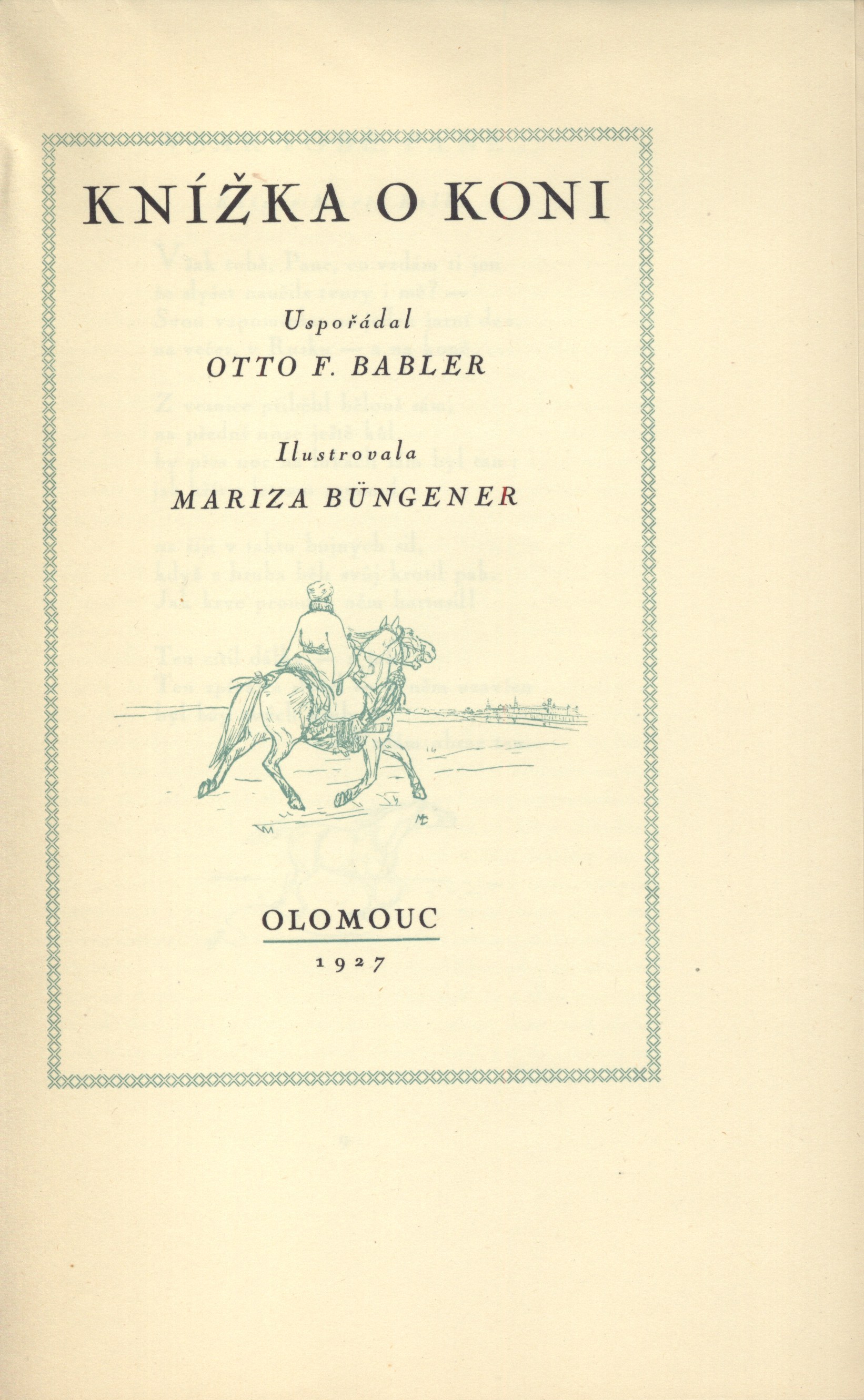 Title information Knížka o koni / uspořádal Otto F. Babler ; ilustrovala [a upravila] Mariza Büngener ; [svázal Fr. Kunovský] Další autoři Babler, Otto František, 1901-1984 (Compiler) (Publisher) Büngener, Mariza (Illustrator) (Book designer) Kunovský, František, 1886-1960 (Binder) Corporation Lidové závody tiskařské a nakladatelské (Olomouc) (Printer) (Printer of plates) Chemigrafia (Brno, Česko) (Etcher) Publication Olomouc : [Otto. F. Babler], 1927 Manufacture Lidové závody tiskařské a nakladatelské spol. s r. o.) Scope 41 s. : il. ; 23 cm ISBN brož. Edition Hlasy / vede Otto F. Babler V.