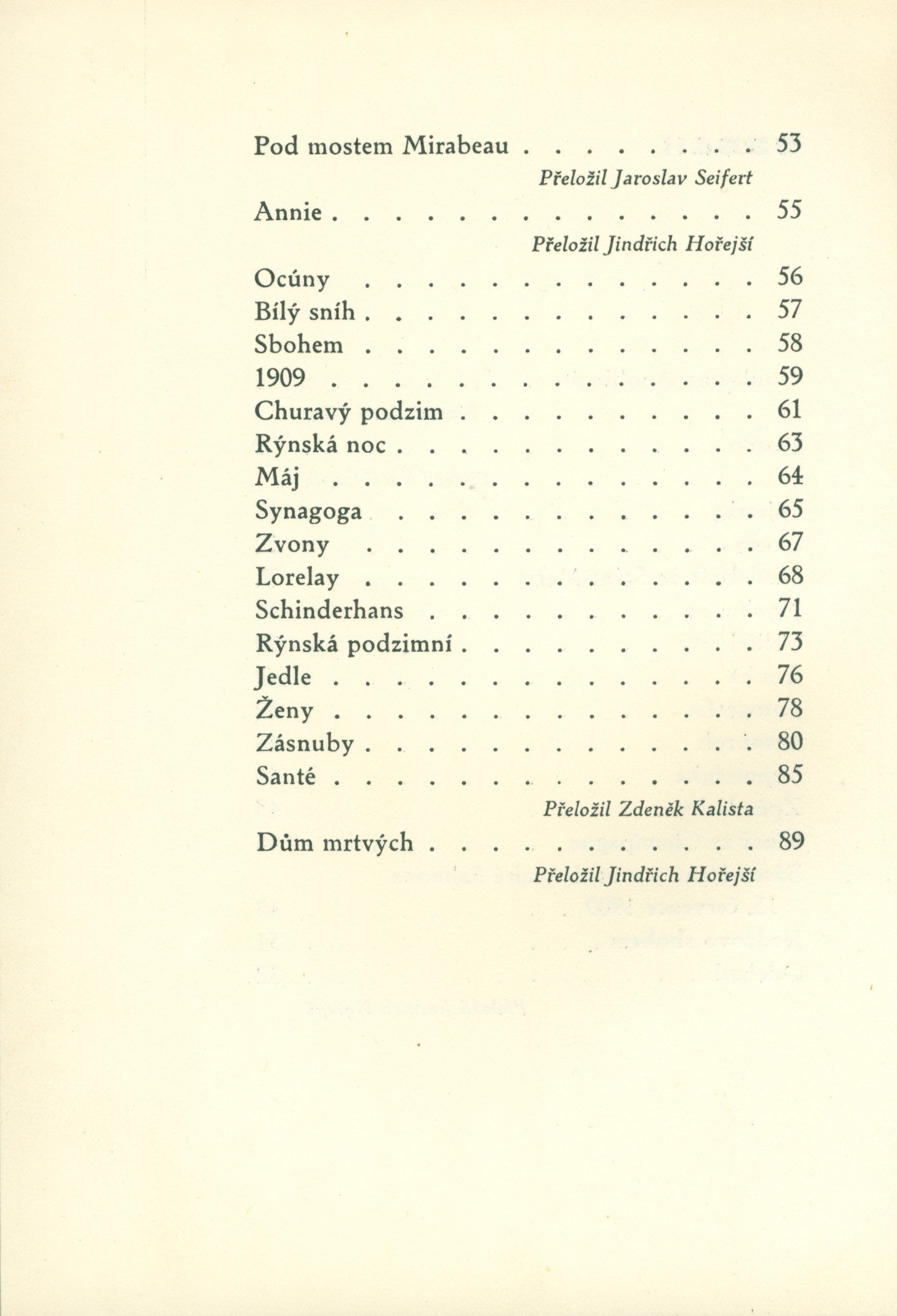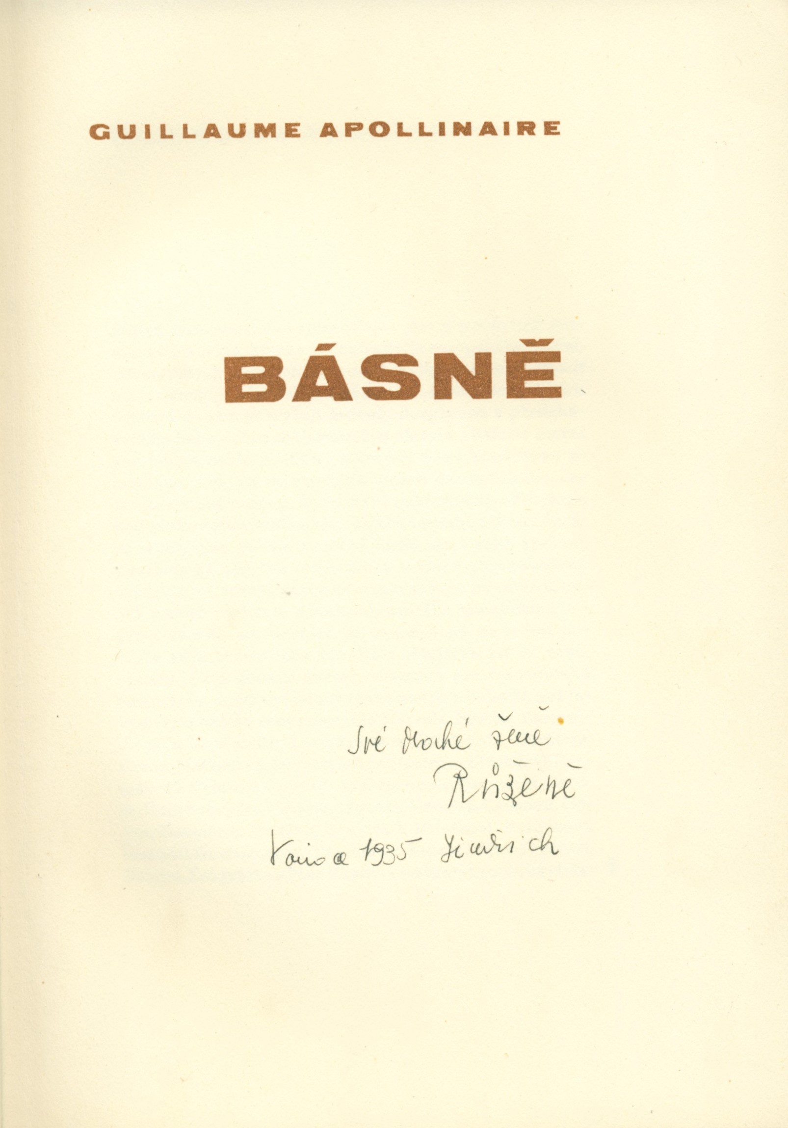 Document kind monografie Personal subjects Apollinaire, Guillaume, 1880-1918 - francouzský básník Keywords Čapek K. * francouzská literatura * poezie * Apollinaire G. * básně * české překlady * Hořejší J. * Kalista Z. * Seifert J. * frontispis * Toyen * r. 1935 Conspect 821.133.1-1 - Francouzská poezie, francouzsky psaná UDC 821.133.1 * 82-1 * =030 Uživatelské pole PNP Knihovna V. Zinkové. U sign. VZinková 0425 (vázaný výtisk) celoplátěná vazba (režné plátno) s hnědočervenou ražbou faksimile podpisu, též textu na hřbetu a horní ořízkou. - Hnědočerveně tónovaný frontispis, mimo paginaci. - Barevně titulní list, mimo paginaci. - Stránkováno až od vlastního textu. - Předmluva: Guillaume Apollinaire. - Obsah. - Tiráž. - Vakát. U sign. VZinková 0425 dedikace na předsádkovém listu (tužkou): "Tradiční knížka k 9. listopadu 1945 se srdečnou gratulací R." U sign. AHO (Archiv Hořejší) - vázaný výtisk s obálkou. - Barevná obálka s ilustrací Toyen (neuvedeno). - Celoplátěná vazba z režného plátna s vínově červenou ražbou faksimile na přední desce a textu na hřbetu, v téže barvě i horní ořízka. - Hnědě tónovaný frontispis s podpisem autorky. - Hnědý titulní list s vepsanou dedikací. - Předmluva. - Obsah. - Tiráž. - Vakát. U sign. AHO (Archiv Hořejší) - dedikace (perem): "Své drahé ženě Růženě Jindřich, Vánoce 1935"; frontispis podepsán tužkou: "Toyen 35". U sign. AHO (Archiv Hořejší) - obálka mírně zašpiněná, místy narušená, výtisk jinak zachován. Rozsah: [4], 97, [7] s. Rozměr: 20,2 cm. Call number Track No. Location Info VZinková 0425 0516/2019 Sbírka AHO 0341 0469/2022 Sbírka