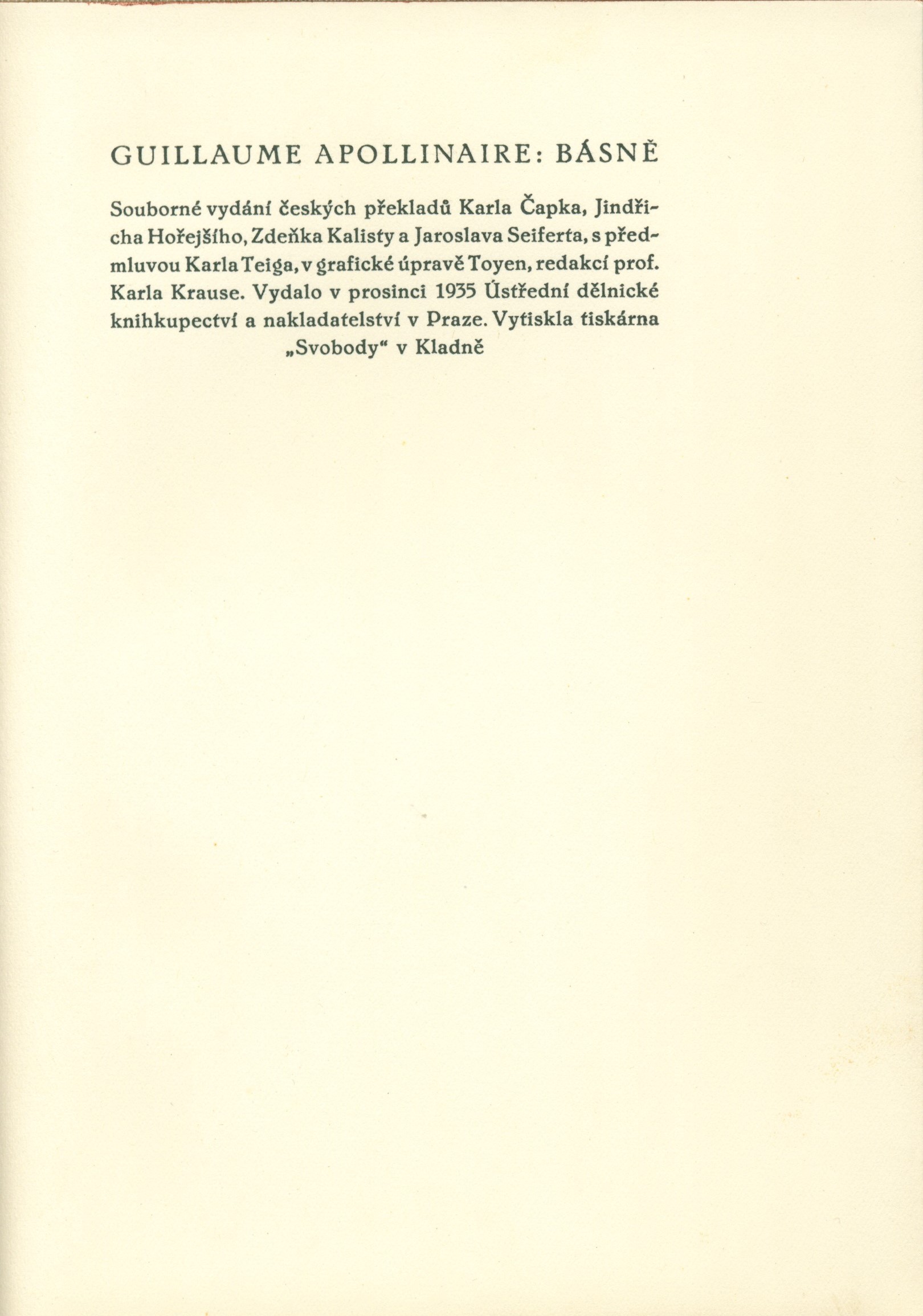 Title information Básně / Guillaume Apollinaire ; souborné vydání českých překladů Karla Čapka, Jindřicha Hořejšího, Zdeňka Kalisty a Jaroslava Seiferta Personal name Apollinaire, Guillaume, 1880-1918 (Author) Další autoři Čapek, Karel, 1890-1938 (Translator) Hořejší, Jindřich, 1886-1941 (Translator) (Dedicator) (Inscriber) Kalista, Zdeněk, 1900-1982 (Translator) Seifert, Jaroslav, 1901-1986 (Translator) Teige, Karel, 1900-1951 (Author of introduction) Toyen, 1902-1980 (Book designer) (Illustrator) (Inscriber) Hořejší, Růžena, 1899- (Dedicatee) Corporation Ústřední dělnické nakladatelství a knihkupectví (Publisher) Svoboda (Kladno) (Printer) (Printer of plates) Edition statement Souborné vydání českých překladů Publication V Praze : Ústřední dělnické knihkupectví a nakladatelství, 1935 Manufacture V Kladně : tiskárna "Svobody" Scope 4 nečíslované strany, 97 stran : ilustrace ; 21 cm ISBN (Vázáno) Country Czech Republic Language Czech Language of the original French Note S předmluvou Karla Teiga