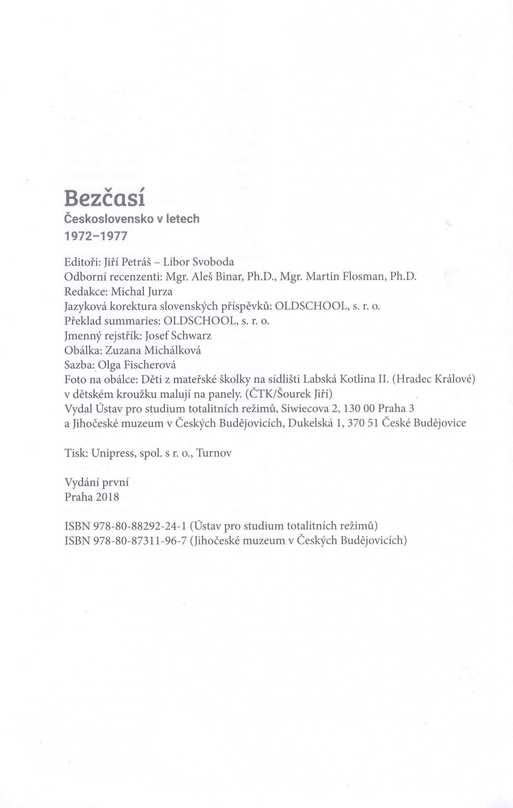 Title information Bezčasí : Československo v letech 1972-1977 / Jiří Petráš, Libor Svoboda (eds.) ; obálka: Zuzana Michálková Další autoři Petráš, Jiří, 1963- (Editor) (Author of introduction) Svoboda, Libor, 1970- (Editor) (Author of introduction) Michálková, Zuzana (Bookjacket designer) Corporation Ústav pro studium totalitních režimů (vědecký ústav) (Publisher) Jihočeské muzeum (České Budějovice, Česko) (Publisher) Unipress (tiskárna) (Printer) Edition statement Vydání první Publication Praha : Ústav pro studium totalitních režimů ; České Budějovice : Jihočeské muzeum v Českých Budějovicích, 2018 Manufacture Turnov : Unipress, spol. s r.o. Scope 567 stran : ilustrace, portréty ; 24 cm ISBN 978-80-88292-24-1 (Ústav pro studium totalitních režimů ; brožováno) 978-80-87311-96-7 (Jihočeské muzeum v Českých Budějovicích ; brožováno) Country Czech Republic Language Czech * English * Polish * Slovak Note Černobílá fotografie na obálce, černý text, nakladatelská značka. - Nakladatelské značky na vakátě. - Obsah. - Předmluva editorů. - Černobílé fotografie, faksimile, tabulky s popisky. - Seznam zkratek. - Autorský kolektiv. - Anotace knihy na zadní straně obálky.
