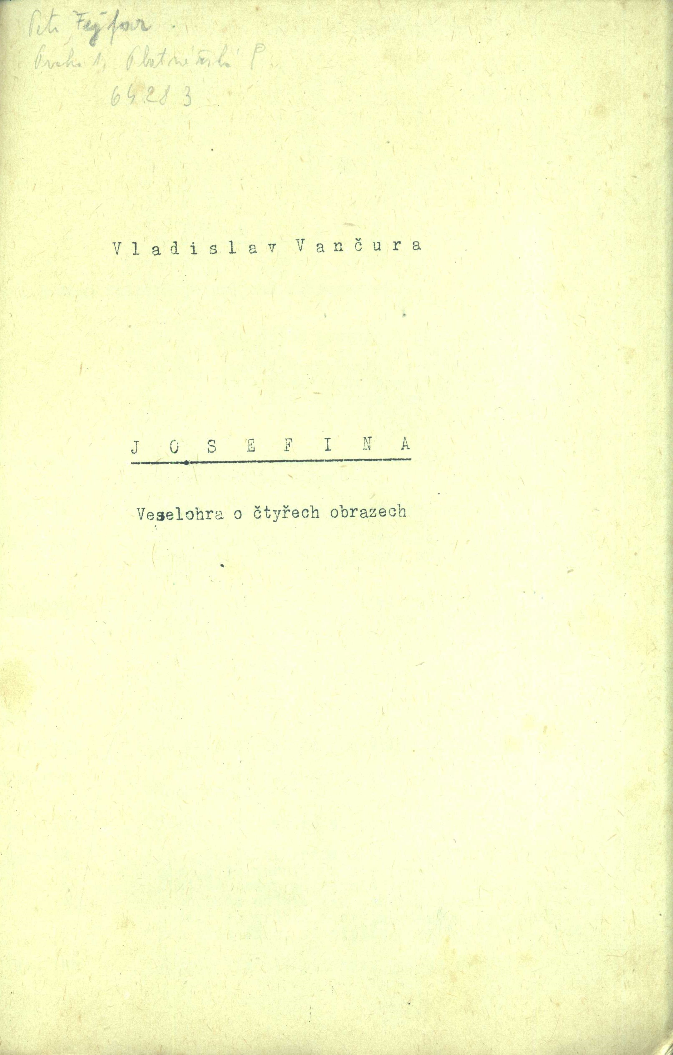 Title information Josefina : veselohra o čtyřech obrazech / Vladislav Vančura Personal name Vančura, Vladislav, 1891-1942 (Author) Další autoři Morávková, Alena, 1935-2024 (Redactor) Grossman, Jan, 1925-1993 (Former owner) Corporation Československé divadelní a literární jednatelství (nakladatelství) (Publisher) Dilia, divadelní a literární agentura (Printer) (Distributor) Publication Praha : Československé divadelní a literární jednatelství, 1959 Manufacture Praha : Dilia Scope 63 listů ; 29 cm ISBN (Brožováno) Country Czech Republic Language Czech Note Odborná redaktorka Alena Morávková
