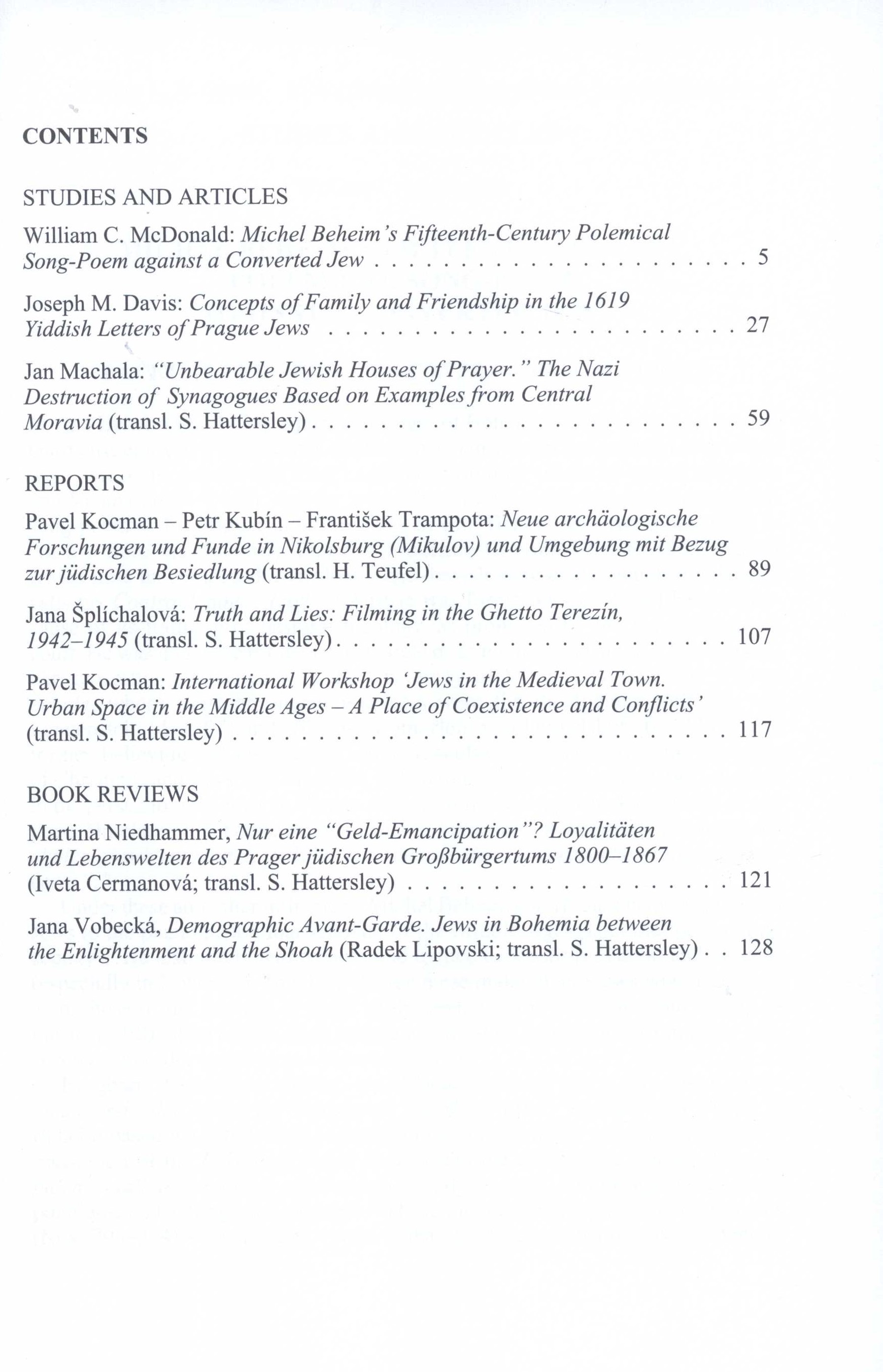 Title information Judaica Bohemiae Další autoři Cermanová, Iveta, 1976- (Editor) Putík, Alexandr, 1950- (Editor) Vašek, Vladimír, 1974- (Graphic technician) Hattersley, Stephen (Translator) Teufel, Helmut, 1944- (Translator) Corporation Židovské muzeum (Praha, Česko) (Publisher) Helvetica & Tempora (Printer) Roč., číslo 49/1, 2014 Publication Praha : Židovské muzeum v Praze, 2014 Manufacture Helvetica&Tempora, spol. s r.o. Scope 131 stran : fotografie, portréty ; 24 cm ISBN (Brožováno) ISSN 0022-5738 Country Czech Republic Language English * German Note Text anglicky a německy. - Čb. fotografie a portréty.
