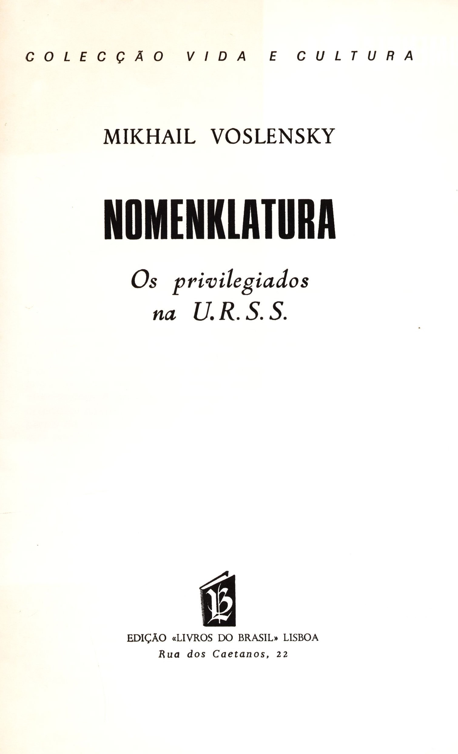 Title information Nomenklatura : Os privilegiados na U.R.S.S. / Mikhail Voslensky ; Tradução de Mascarenhas Barreto Personal name Voslenski, Michael, 1920-1997 (Author) Další autoři Barreto, Augusto Mascarenhas, 1923-2017 (Translator) Corporation Livros do Brasil (Publisher) Publication Lisboa : Livros do Brasil, [1980] Copyright notice date ©1980 Scope 458 stran; 22 cm ISBN (vázáno) Edition Vida e cultura ; 93