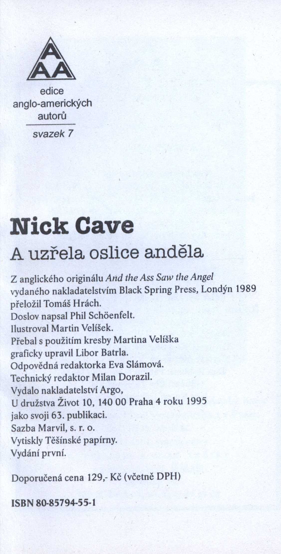 1. Title informationA uzřela oslice anděla / Nick Cave ; [z angličtiny přeložil Tomáš Hrách ; ilustroval Martin Velíšek ; doslov napsal Phil Schöenfelt ; přebal s použitím kresby Martina Velíška graficky upravil Libor Batrla]