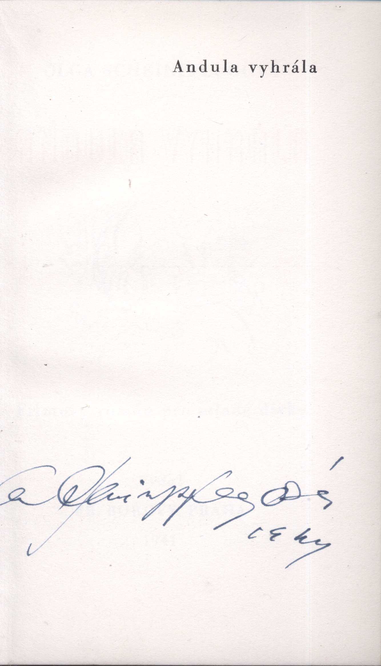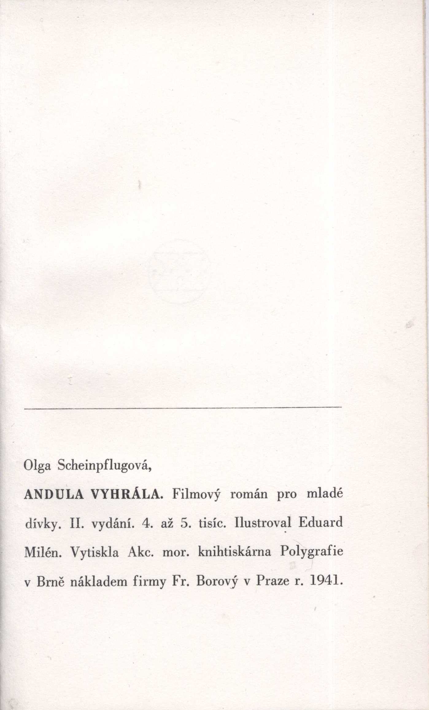 Title information Andula vyhrála : filmový román pro mladé dívky / Olga Scheinpflugová ; [ilustroval Eduard Milén] Personal name Scheinpflugová, Olga, 1902-1968 (Author) Další autoři Milén, Eduard, 1891-1976 (Illustrator) (Bookjacket designer) Corporation Fr. Borový (firma) (Publisher) Akciová moravská knihtiskárna Polygrafie (Printer) Edition statement 2. vyd. Publication Praha : Fr. Borový, 1941 Manufacture Akc. mor. knihtiskárna Polygrafie) Scope 207 s., [2] obr. příl. : il. ; 8° ISBN (váz.) Country -cs Language Czech Note Zdobená obálka a titulní list. - Na přední záložce poznámka o knize. - Nakladatelská značka. - Černobílé ilustrace. - 2 barevné celostranné ilustrace na příloze. - Na zadní záložce poznámka o autorce a jejím díle. - Na zadní straně obálky značka nakladatelského sdružení Kmen