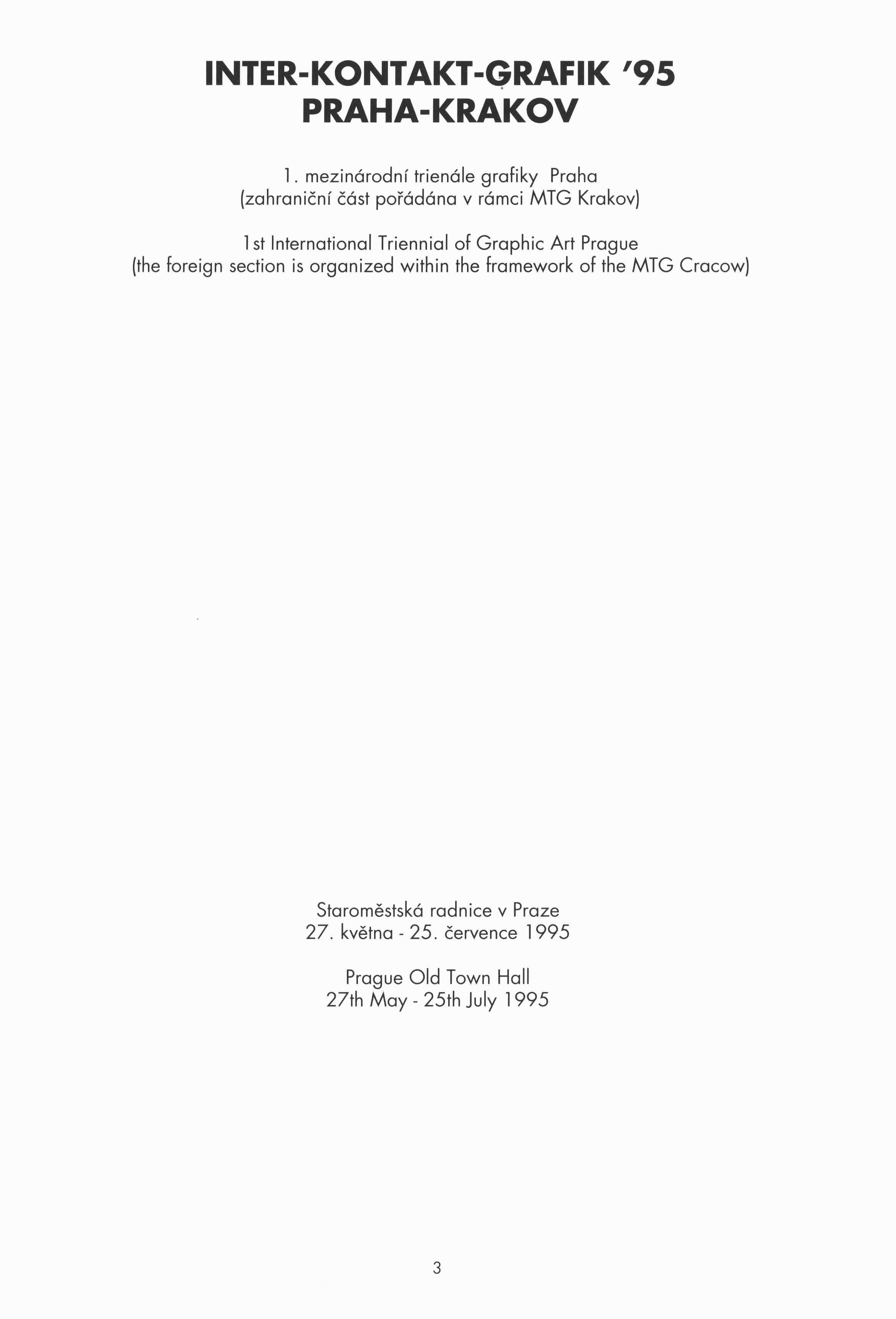 Title information 1. mezinárodní trienále grafiky Praha = 1 st International Triennial of Graphic Art Praque. = The message of the sign : between letter and image : Inter-Kontakt-Grafik '95 Praha-Krakov : Staroměstská radnice v Praze 27. května - 25. července 1995 / [pořadatelé Nadace Inter-Kontakt-Grafik ... et. al. ; koncepce Simeona Hošková ; fotografie Zdeněk Raiser ; grafická úprava Karel Míšek] Main entry-action Mezinárodní trienále grafiky Další autoři Hošková, Simeona, 1945-2015 (Editor) Raiser, Zdeněk (Photographer) Míšek, Karel, 1945- Corporation Nadace Inter-kontakt-grafik Další var.názvy Message of the sign: between letter and image Poselství znaku: mezi písmem a obrazem Publication Praha : Středoevropská galerie a nakladatelství : Asociace volné grafiky, 1995 Manufacture Label) Scope 166 s. : barev. il. ISBN 80-901559-4-4 (Středoevropská galerie a nakladatelství : brož.) Country Czech Republic Language Czech * English Note Zahraniční část pořádána v rámci MTG Krakov. - Souběžný anglický text. - Obsahuje bibliografické odkazy.