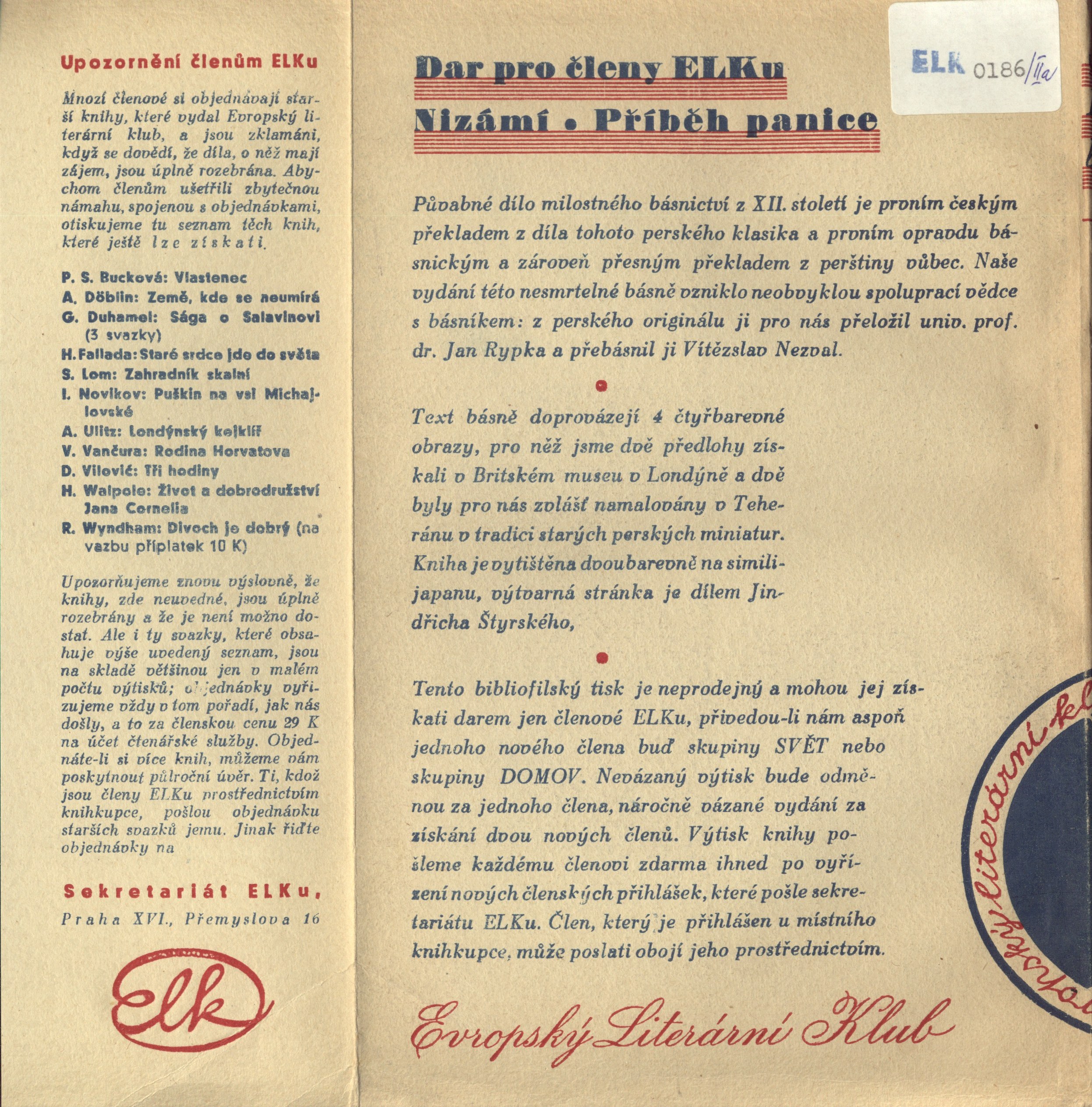 Document kind monografie Translation of No arms, no armour Personal subjects Henriques, Robert D. Q. (Robert David Quixano) 1905-1967 - anglický spisovatel Keywords překladová literatura * anglická literatura * román * próza * autobiografické prvky * kolonie * vojáci * r. 1928 UDC 355.11 * 821.111 * 82-3 * =030 * 82-31 * 82-312.6 * 355.01 Uživatelské pole PNP U sign. ELK 0186/IIa (brožovaný výtisk) barevná ilustrovaná obálka (K. Svolinský). - Na přední záložce upoutávka na knihu a značka ELKu. - U barevné nakladatelské značky razítko Archiv Čs. spisovatel, č. P 705. - Patitul. - Dvoubarevný titulní list s ilustrací (K. Svolinský). - Životopisná poznámka (J. P.) - Ukazatel výslovnosti vlastních jmen. - Tiráž. - Na zadní záložce nakladatelské upoutávky, opakující se nakladatelská značka. - Na zadní straně obálky upoutávka na jiný titul. U sign. ELK 0186/IIa je přední část obálky ve hřbetu částečně oddělená. Tiráž: "R. D. Q. Henriques: Bez meče, bez štítu. Druhý díl románu poctěného první cenou v Světové románové soutěži 1939, pořádané v české jazykové oblasti Evropským literárním klubem a nakladatelstvím Fr. Borového. Z anglické předlohy přeložil Vladimír Procházka. Podle typografické úpravy Stanislava Kohouta vytiskla Akciová moravská knihtiskárna Polygrafie v Brně garmondem písma Bodoni. Obálku, vazbu a kresbu na titulní list navrhl Karel Svolinský. Pro své členy vydal Evropský literání klub v Praze 1. května roku 1940." Rozsah: 313, [3] s. Rozměr: 22,4 cm Originál No arms, no armour vyšel v roce 1939. Call number Track No. Location Info ELK 0186/IIa 0762/2013 Sbírka